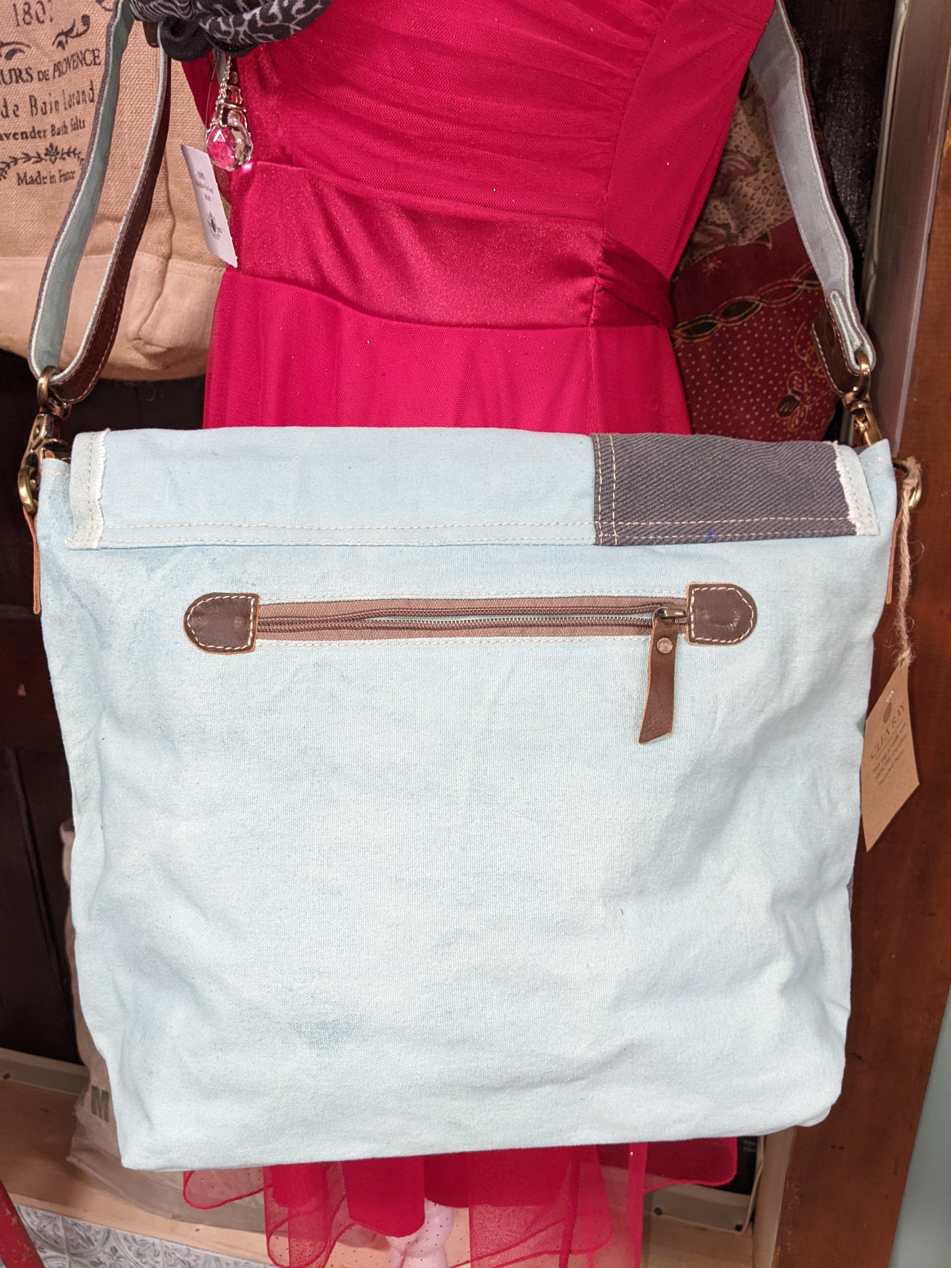 The perfect messenger bag! It zippers closed with snapped flap for a stylish look. Keep everything organized with a zippered inside pocket and two inside front pockets. Don't forget the extra pocket in the back. Made from recycled military tent and canvas with leather accents.
