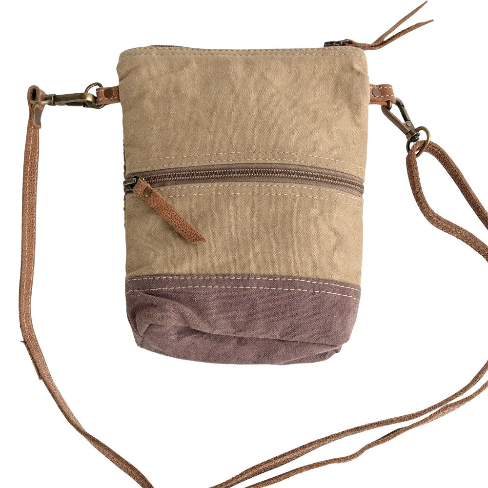 Material: Recycled military tent and canvas with leather accents. Measures: 5.5" x 8.5" Adjustable strap.