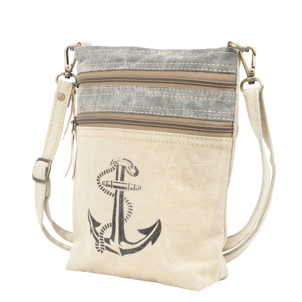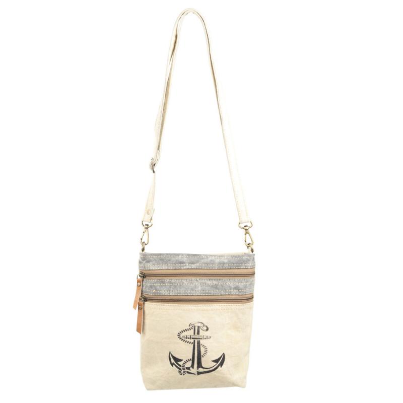The perfect bag to show off our nautical side. Beautifully stamped canvas gives way to a double zipper front and a zipper in the back. Enough pockets to everything in place. A top zippered closure and inside pockets keep your belongings secure.