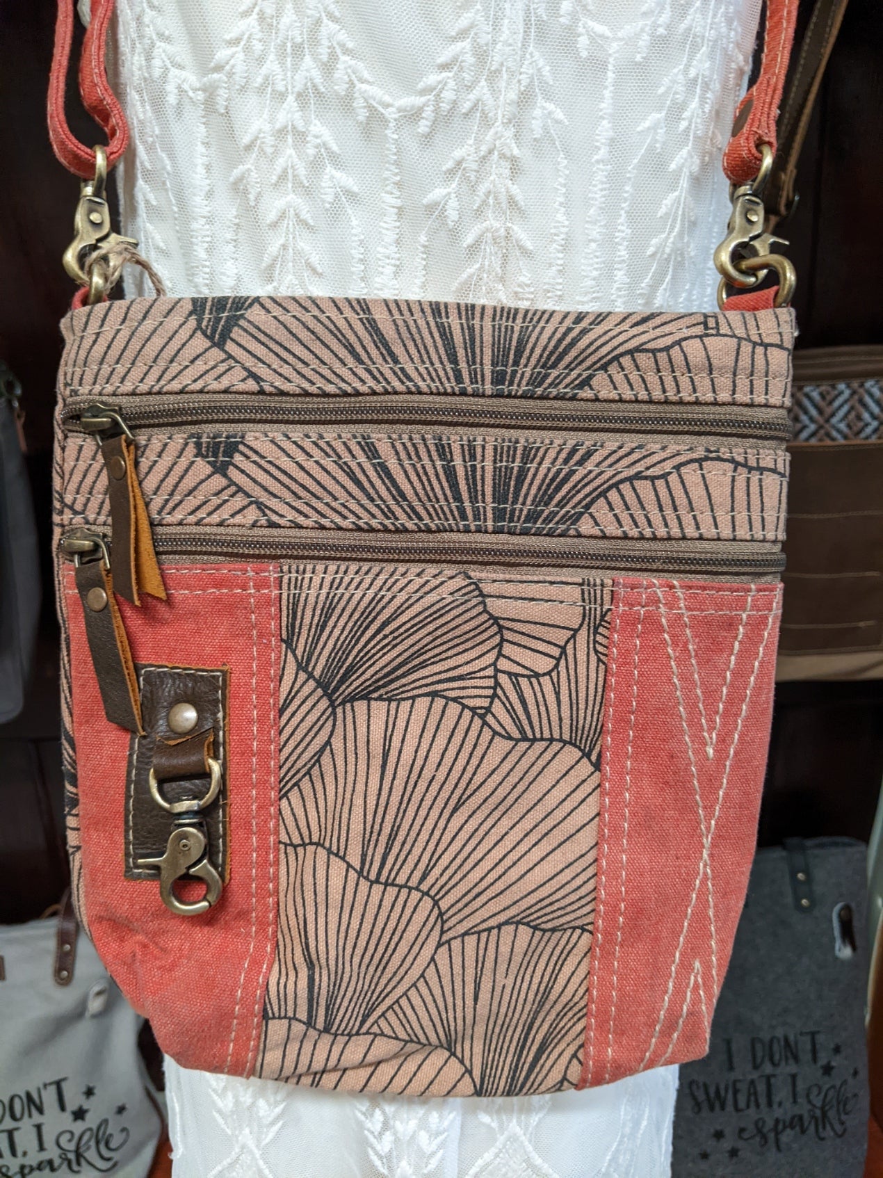 Pretty as a petal! This shoulder bag has it all! Two zippered pockets on the front, and one zippered pocket on the back. A top zippered closure and even a zippered pocket on this inside. The strap is adjustable and can be worn crossbody.