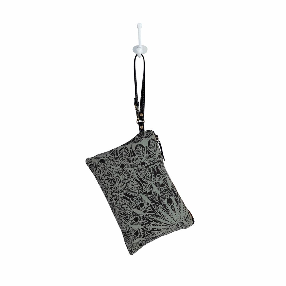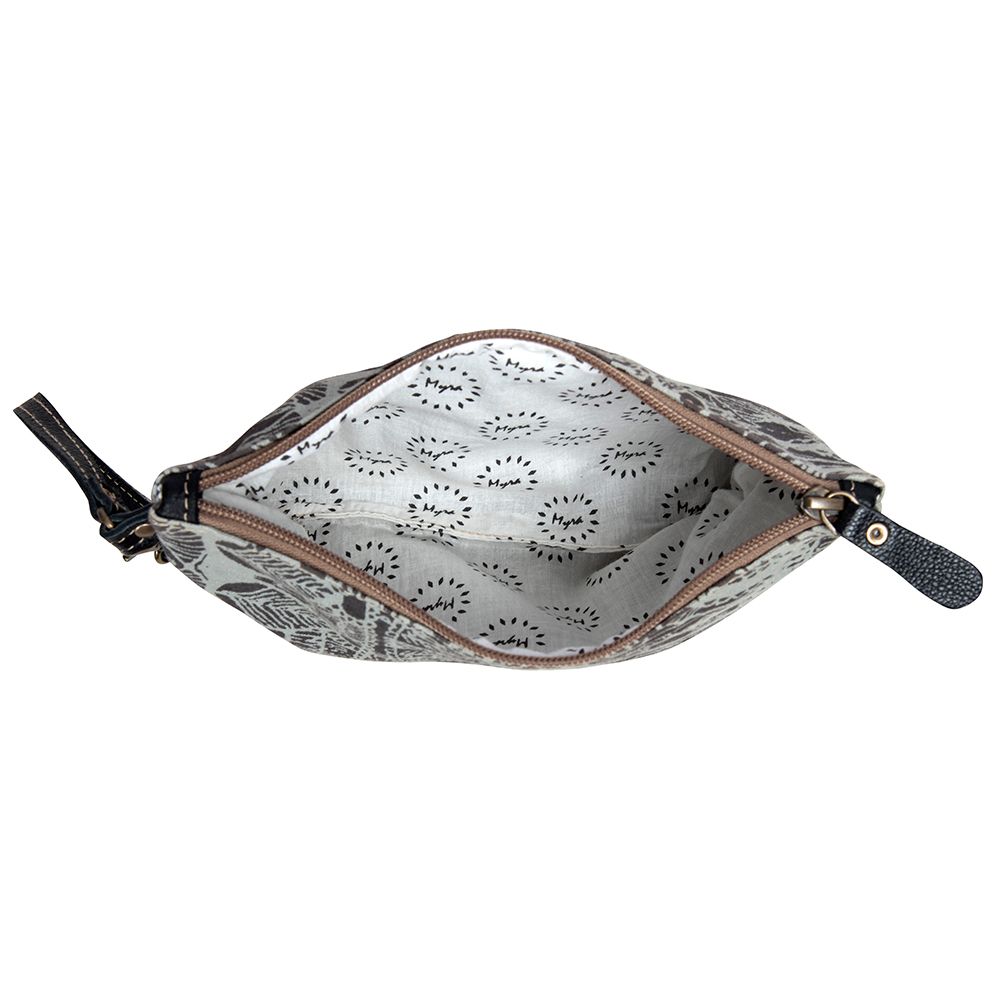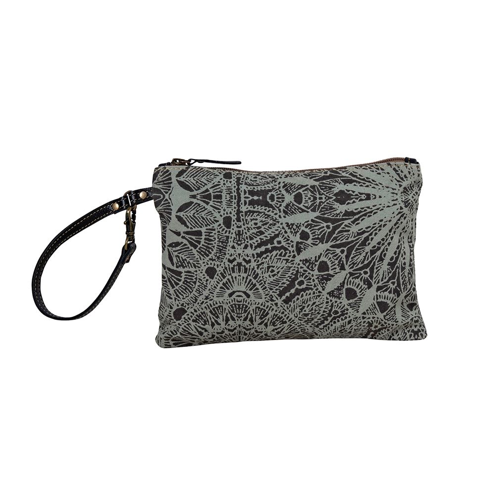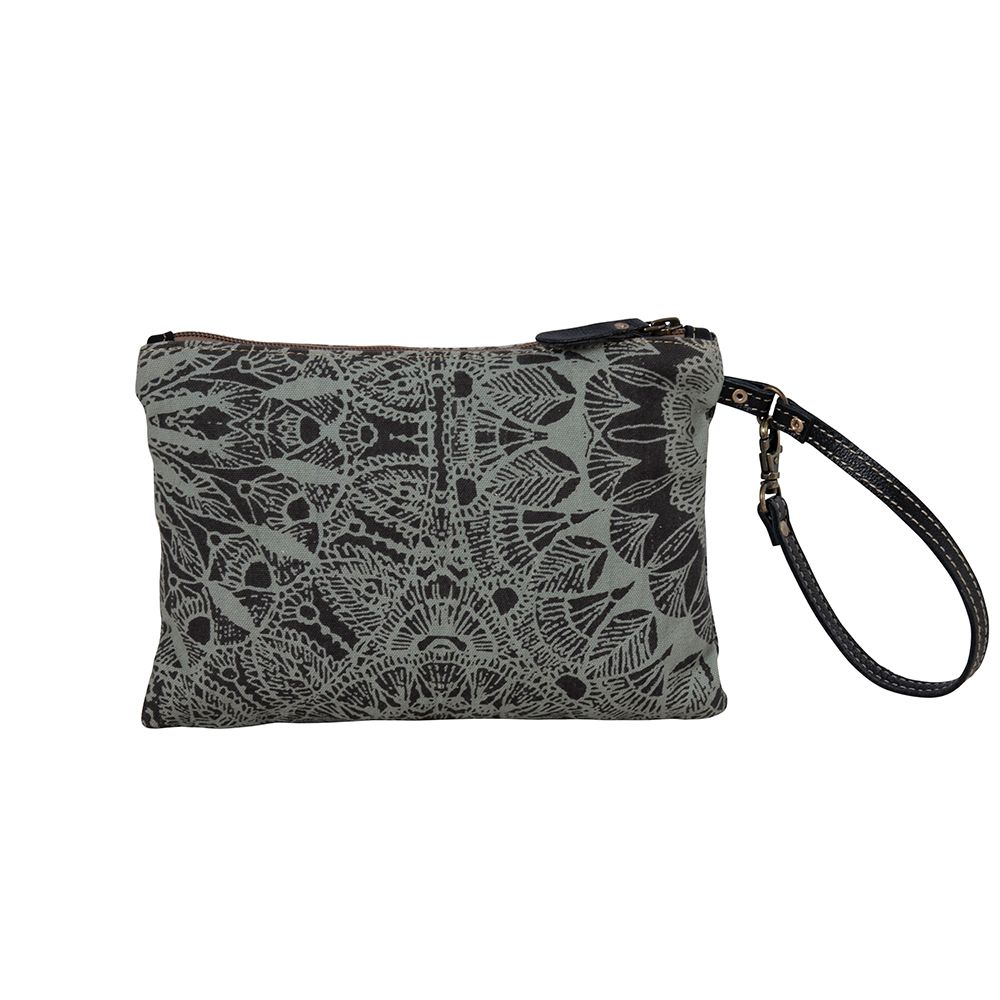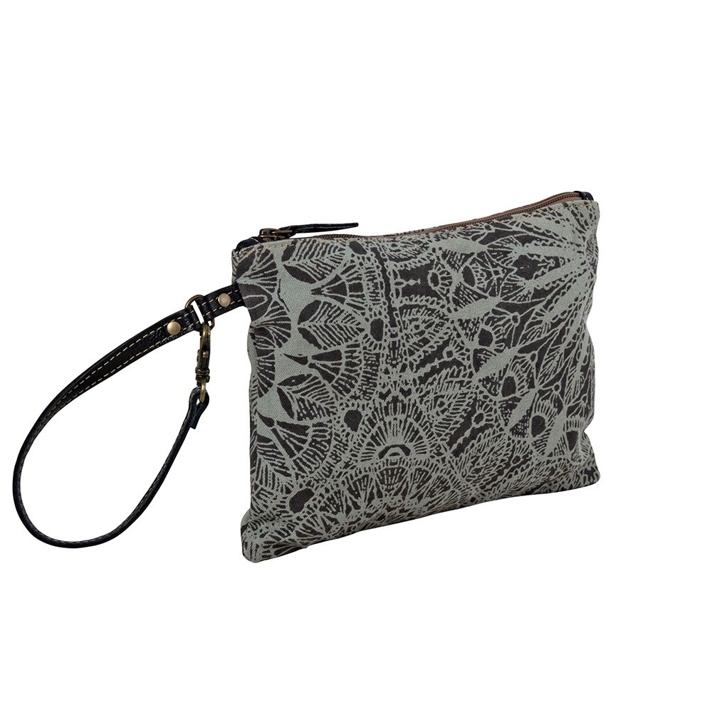 Experience style and convenience with the Bison Terrace Pouch. Made with a lovely floral-inspired geometric design, this woven canvas pouch features a secure zipper closure and a warm brown leather wristlet handle. Stay in style with this eye-catching and functional pouch.
