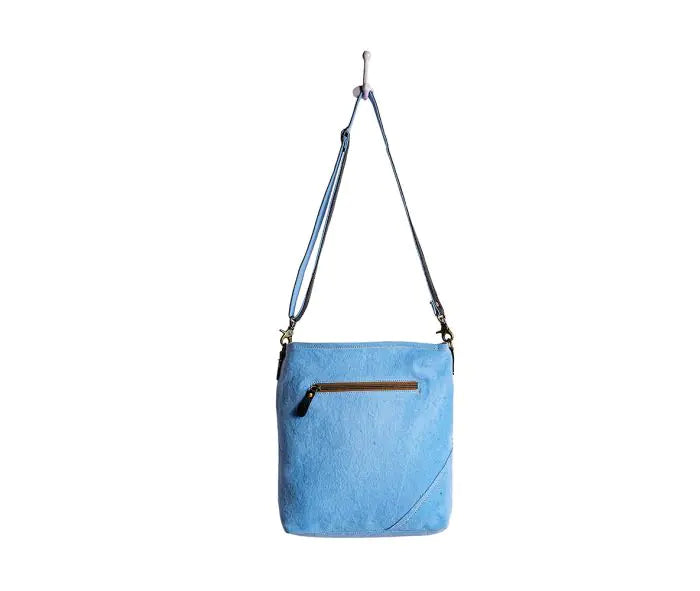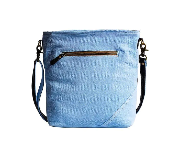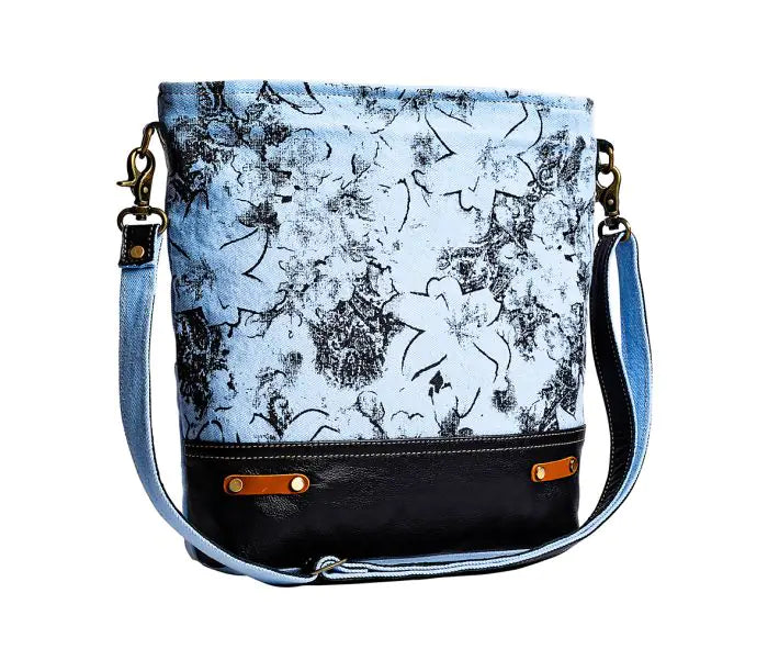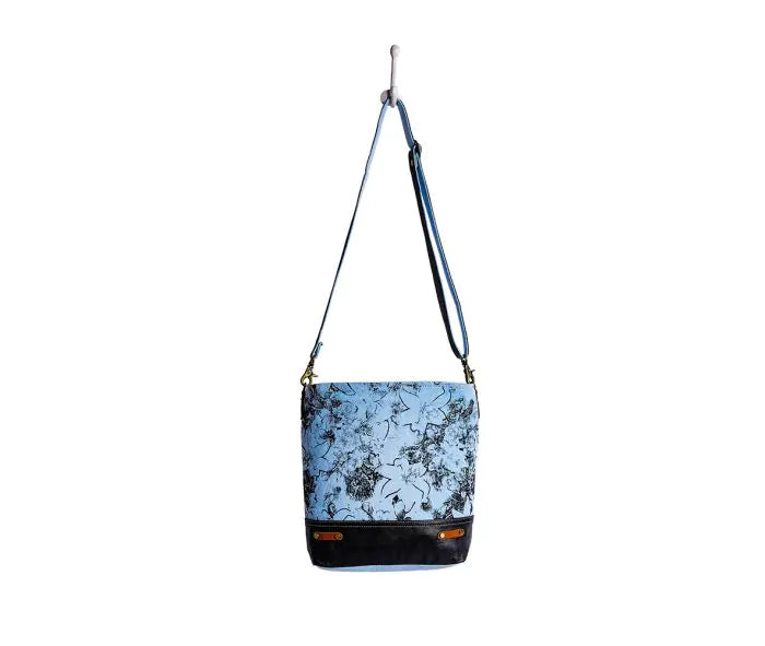 Indulge in the Bleu Creek Meadow Crossbody Bag, featuring a gorgeous floral pattern on the front and durable sky blue canvas on the back. The convenient extra zipper and detachable duo-tone leather strap make this bag irresistible. Treat yourself to this stylish and versatile accessory.