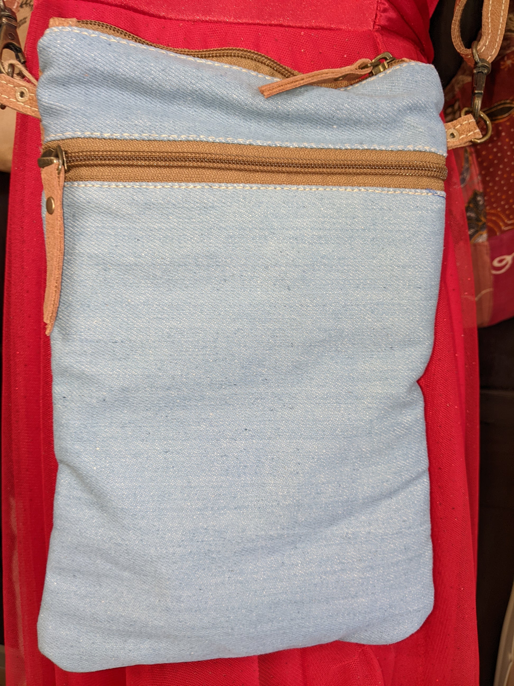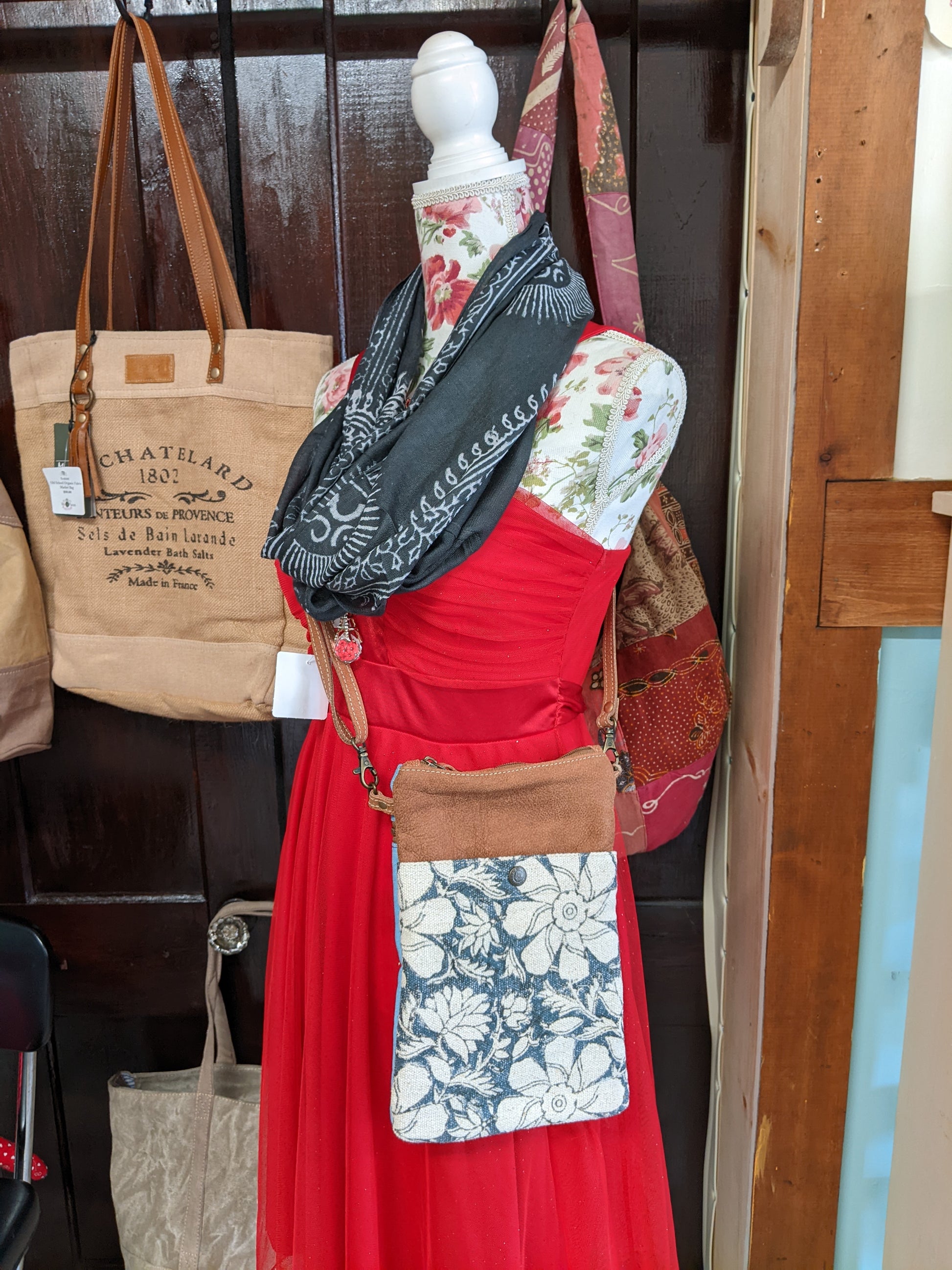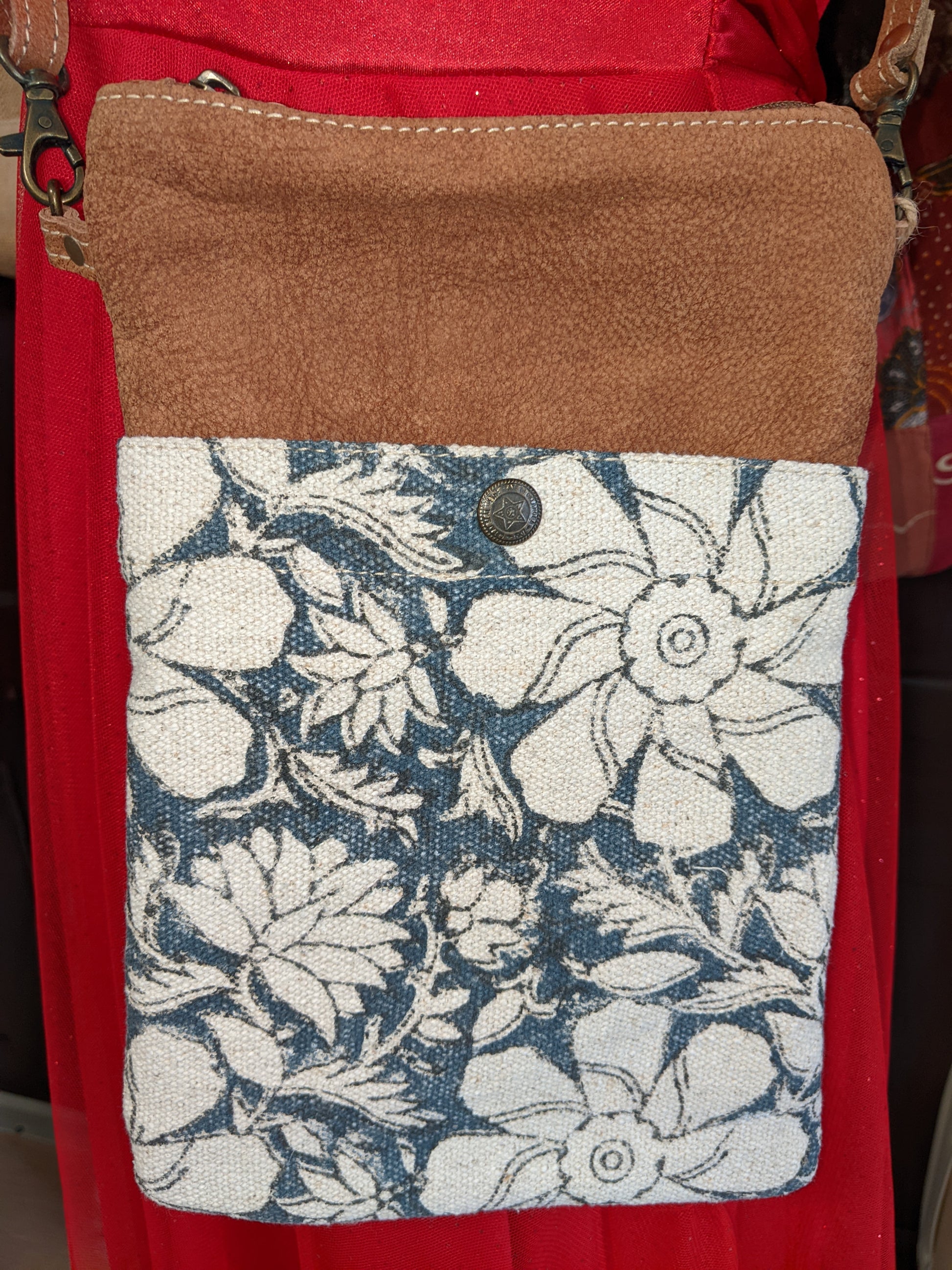 Travel in style with our Blue Flowers & Leather Passport Bag! Featuring a stamped blue and white floral pattern, leather accents, and recycled military tent and canvas, this bag is perfect for the eco-conscious traveler. With a top zippered closure and back zippered pocket, your belongings will stay secure while you explore. (Passport not included.)