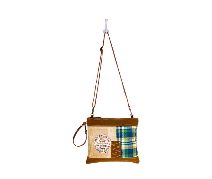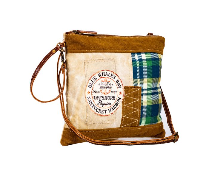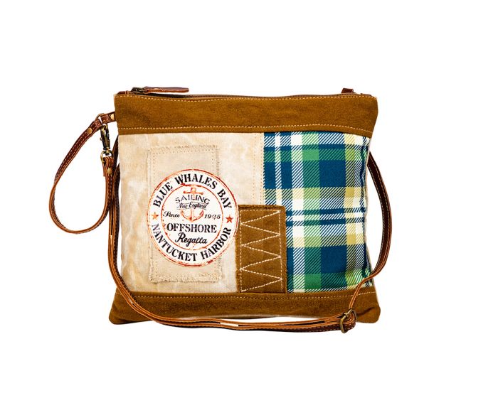 Experience the perfect combination of style and functionality with the Blue Whales Bay Crossbody Bag, which is made from upcycled patchwork canvas. It features warm hues and a charming coastal design. The bag also comes with a wristlet handle and an adjustable shoulder strap for convenience. It is a must-have for any fashion-forward individual.
