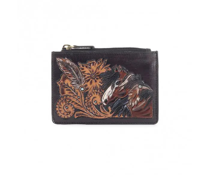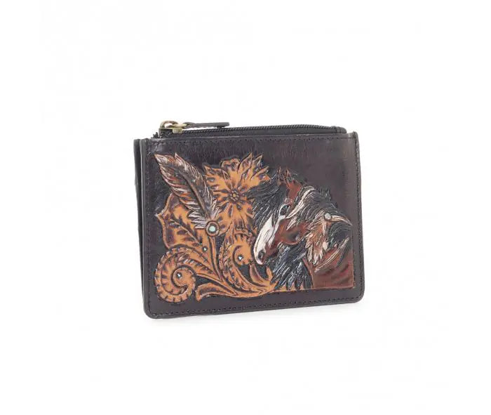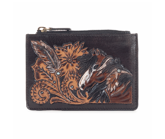 The Caballo Mio Credit Card Holder is a charming, hand-tooled leather wallet featuring a Western foliage scene and a majestic prairie stallion. With slots for your ID and cards, a zippered inner pocket, and an inner key ring, this wallet offers both practicality and visual appeal. Keep your important items secure and at hand with this fun accessory. Expertly crafted for a stunning look and lasting durability.