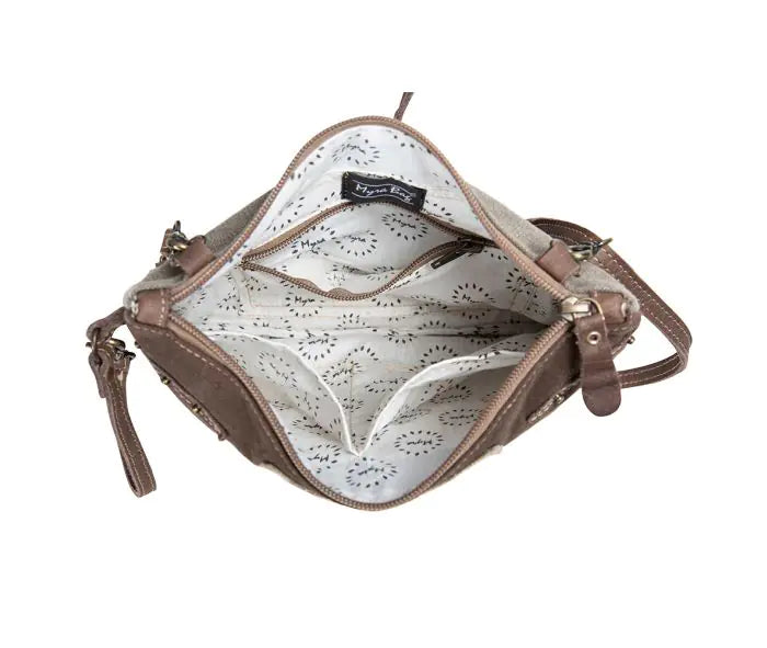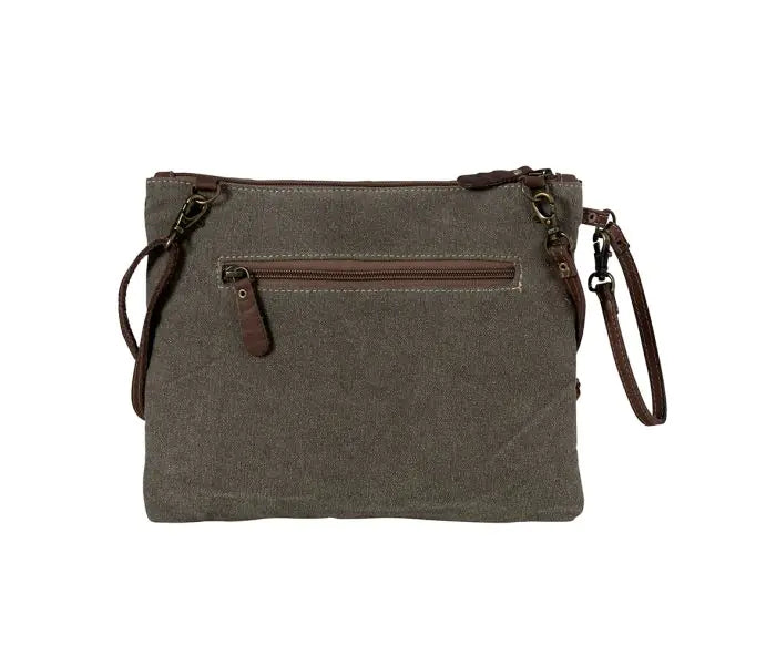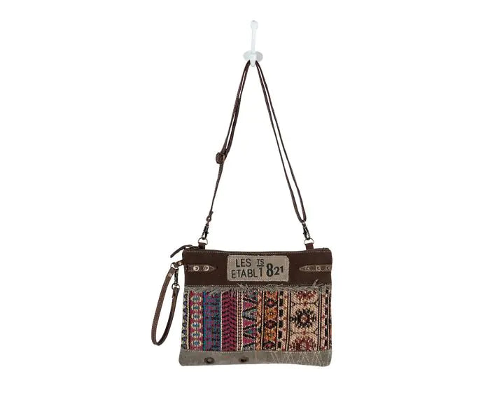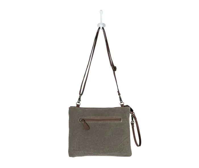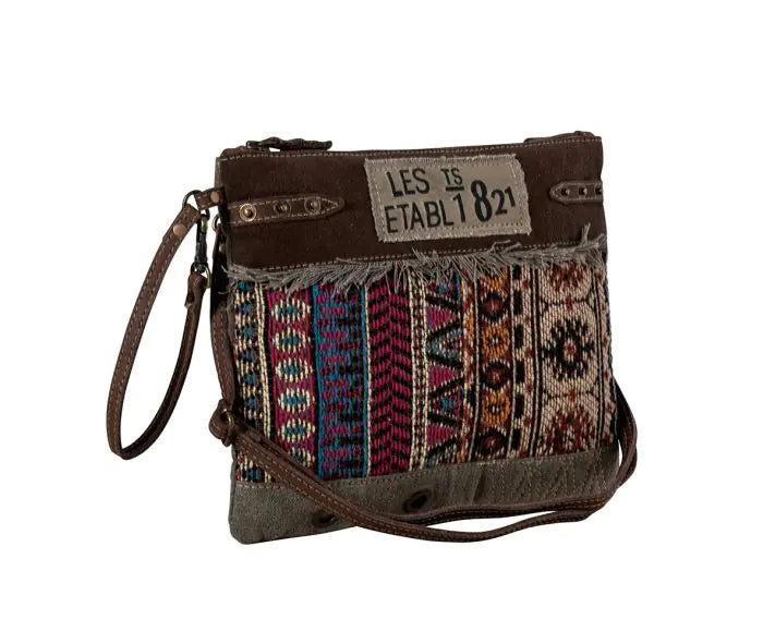 Our Vintage Journeys Crossbody is a must-have with its vintage-inspired design and unique combination of grey and brown canvas adorned with upcycled rug. Complete with fringe and metal accents, this versatile bag can be worn as a wristlet, shoulder, or crossbody. Featuring a back zippered pocket, top zipper closure, and multiple inside pockets for easy organization.