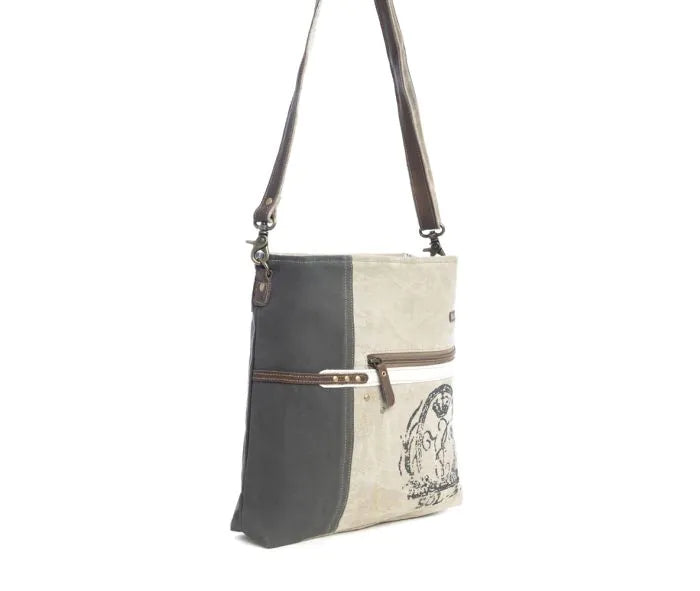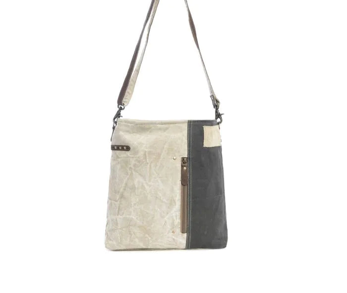 Elevate your style with the Des Royale Crossbody Bag. Its duo-tone woven canvas design exudes regal elegance, accented with leather and brad details. With zippered pockets on the front and back, and an adjustable, detachable shoulder strap, this bag combines convenience and sophistication. Channel your inner royalty with every wear.