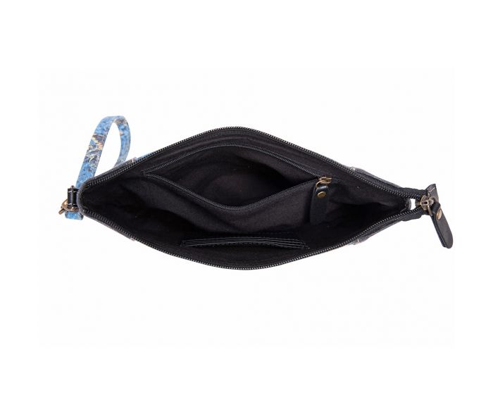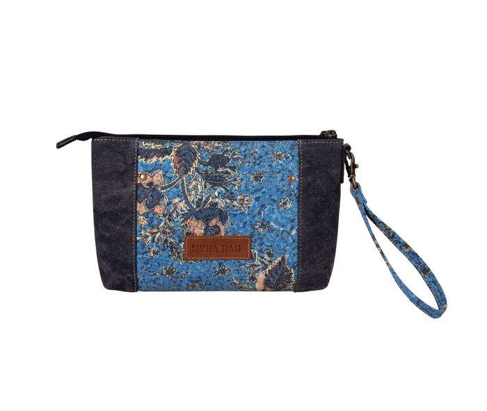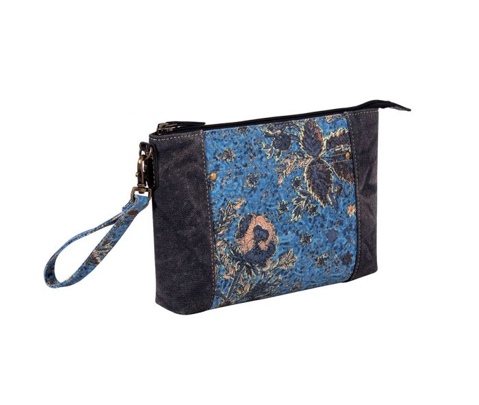 The Desmond Mesa Pouch is a stunning canvas pouch that features delicate flowers and foliage in shades of blue, yellow, and peach. Its design is complemented by a dark, dusty blue denim-look canvas, and the inner compartments make it easy to keep your items organized. With a zipper closure and a matching canvas wristlet strap, this pouch is practical and charming.