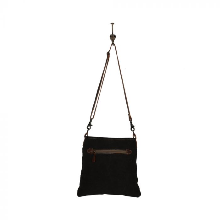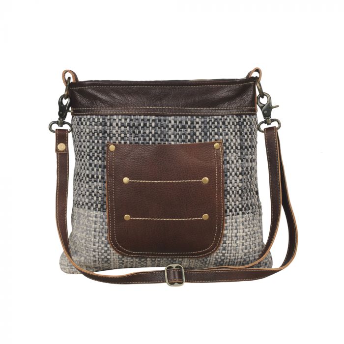 Looking for something to go with your fall and winter wardrobes? We have the perfect bag in a beautiful navy and cream rug accented with leather and canvas. A zippered top closure reveals two drop pockets and a zippered pocket on the inside. A zippered back pocket and front drop pocket keeps your favorite things close.