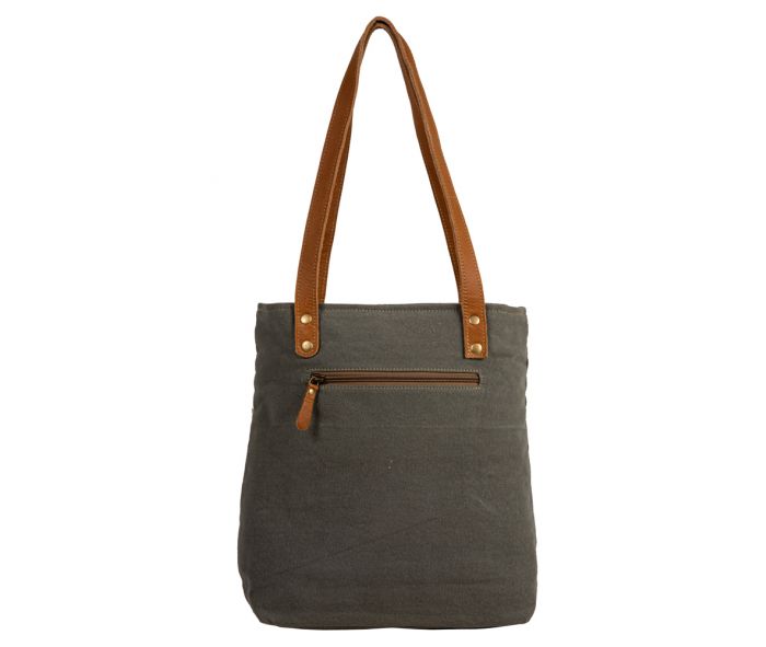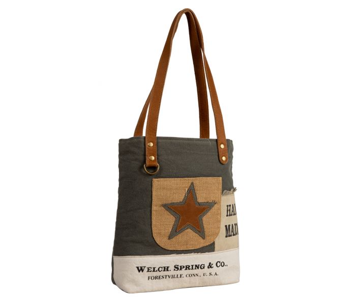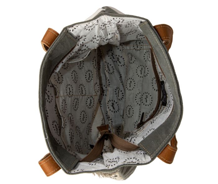 This charming bag hearkens to vintage market bags, with its patchwork accents in burlap, canvas, and leather. It also includes fanciful wording overprints and duo-tone gray and ivory canvas. The back continues the gray canvas with an extra zippered pocket. Durable carrying shoulder straps in matching leather. It also has two inside drop pockets and a zippered inside pocket.
