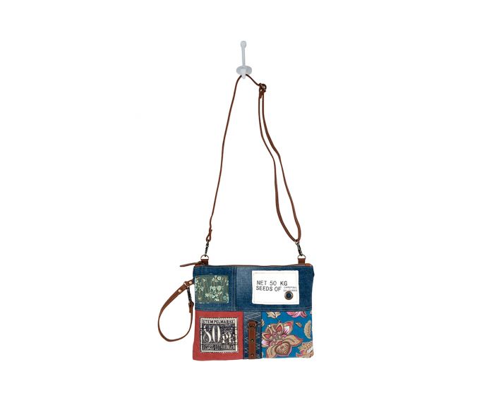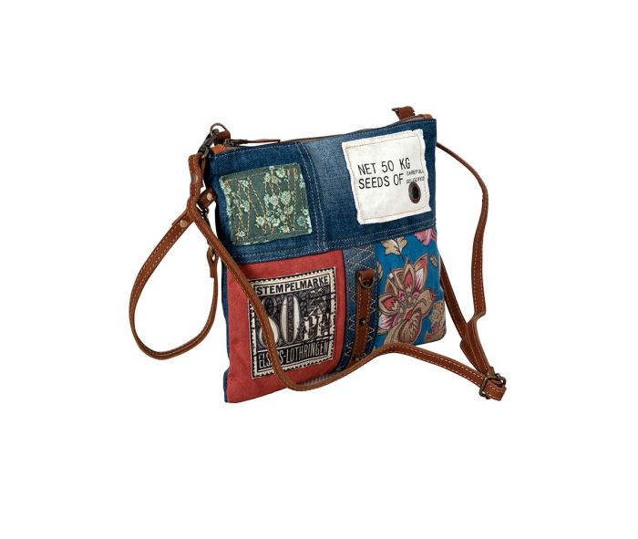 Elevate your style with our Floral Delight Crossbody Bag! This charming bag seamlessly combines floral patchwork with denim for a unique design. Leather and brad accents add a touch of elegance, while the zipper-close top and detachable, adjustable leather straps offer practicality and versatility. Make a statement with this whimsically worded accessory.0