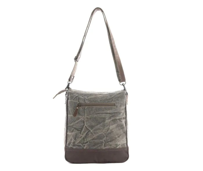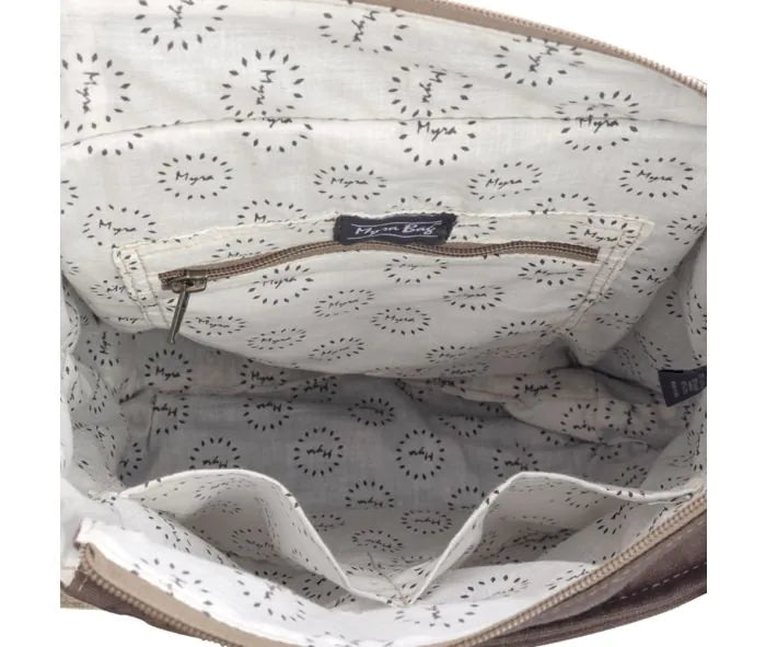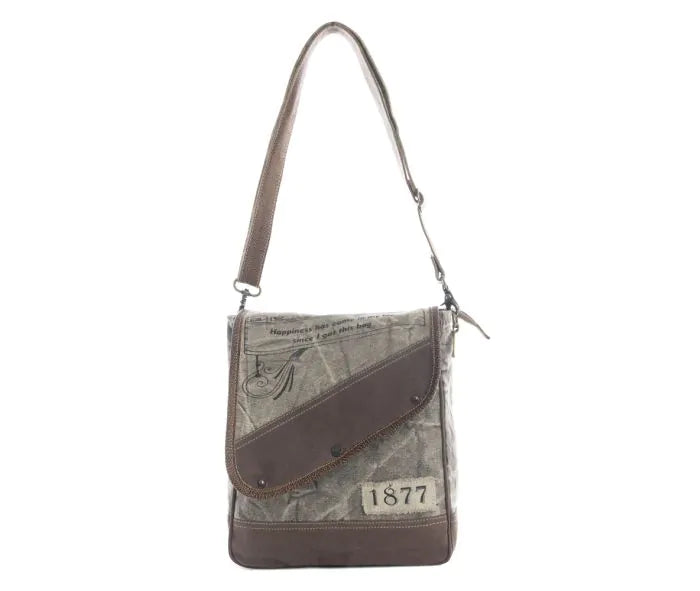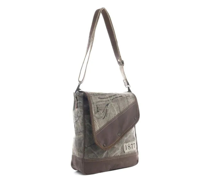 Indulge in elegance with our Happiness Vintage-look Shoulder Bag. The woven canvas and luxurious dark chocolate leather exude a sophisticated vibe, while the vintage-inspired overprint and special brad add an eclectic twist. The zipper-close top and durable leather straps make this bag versatile and fun.