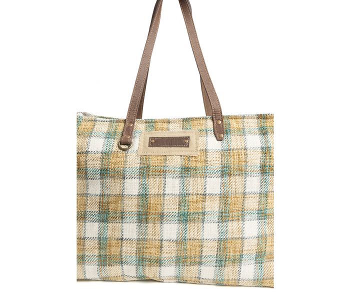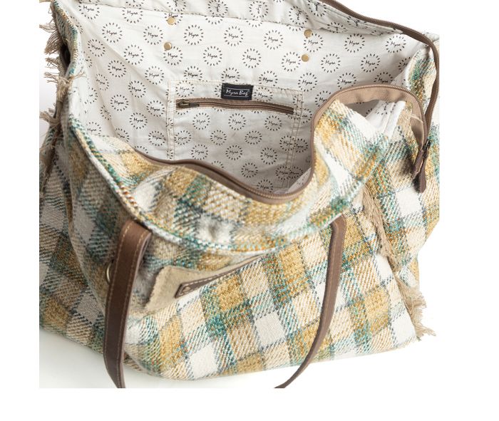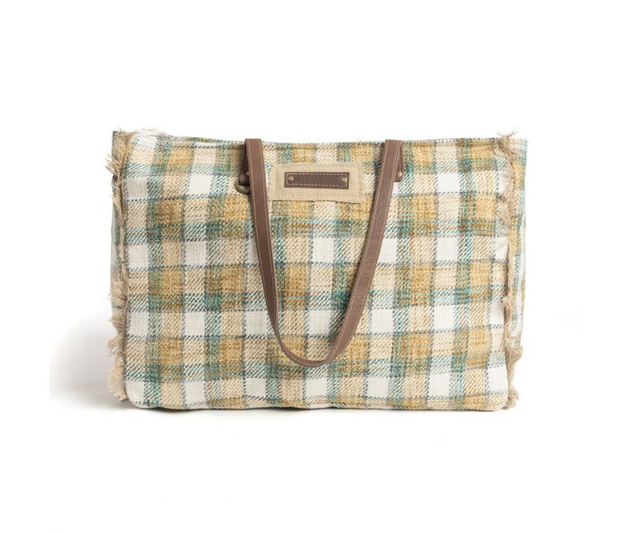 Travel in style with our Heartland Weekender Bag. The cozy upcycled rug in a charming plaid pattern exudes warmth, while the unique accents and convenient slip pockets make it practical for any trip. The durable leather straps add a touch of luxury. With a back zippered pocket, two inside drop pockets, and an inside zippered pocket, it's perfect for family getaways or long excursions. Stay chic and stylish wherever you go!
