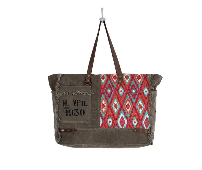 Experience the perfect blend of style and functionality with our Hi Trails Weekender Bag. Featuring a unique textured design and leather accents, this bag is made from an upcycled woven rug in hues of sandstone red, sky blue, and ivory. With a zipper-close top, side pockets, and leather carrying straps, it's the perfect companion for your next adventure.