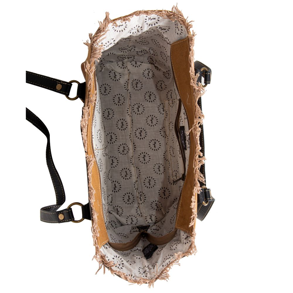 This fantastic bag features plenty of room to carry your essentials. A charmingly dimensional front, with two-tone canvas, a sewn leather star accent, a flapped pocket, fanciful worded overprinting, and frayed-edge treatments make for a wonderfully textured look. Two drop pockets and a zippered pocket on the inside. An additional zippered pocket on the front, zipper-close top, woven canvas back with zippered pocket, and durable black leather carrying shoulder straps finish this fabulous bag!