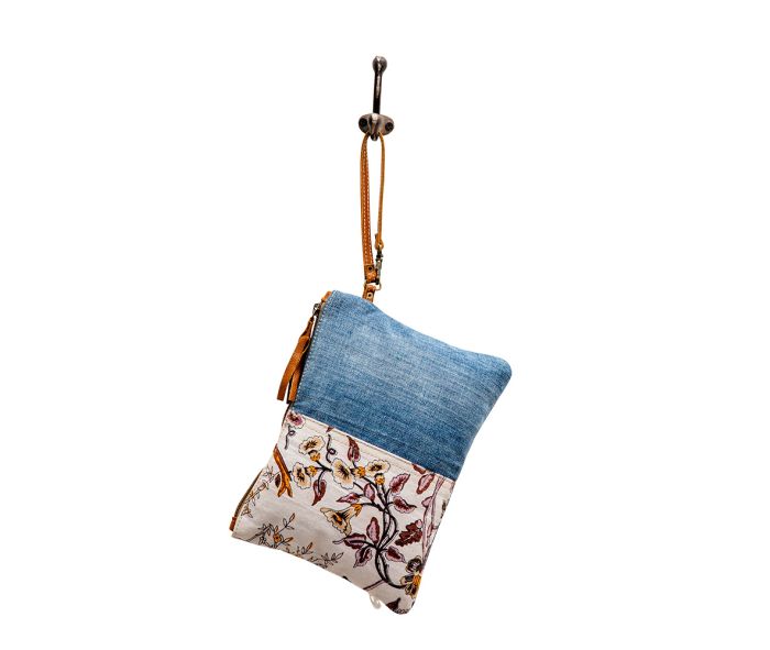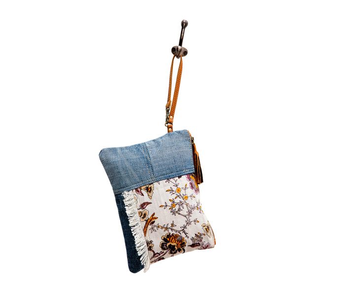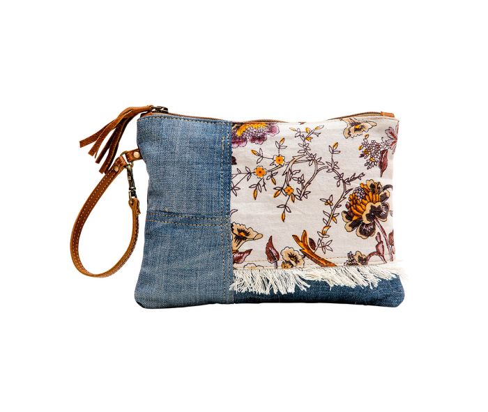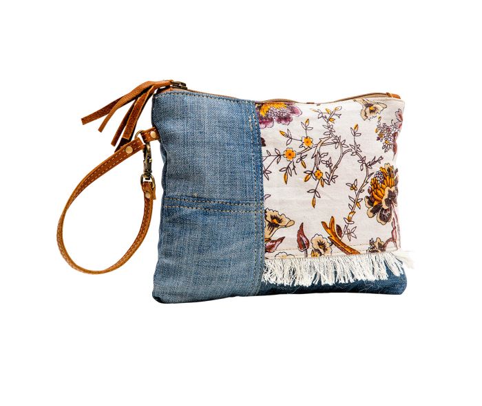 Take a stand against boring style with the Ravish Pouch! It is made with recycled denim and fabric and has a unique and fashionable fringe detail. Use the practical wristlet to take it wherever you go - it's the perfect way to show off your eco-friendly style.