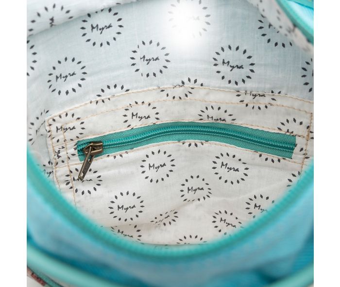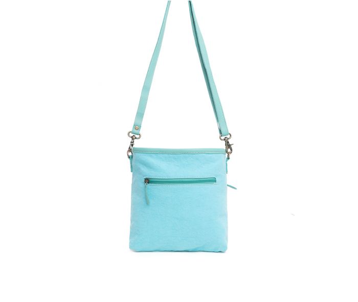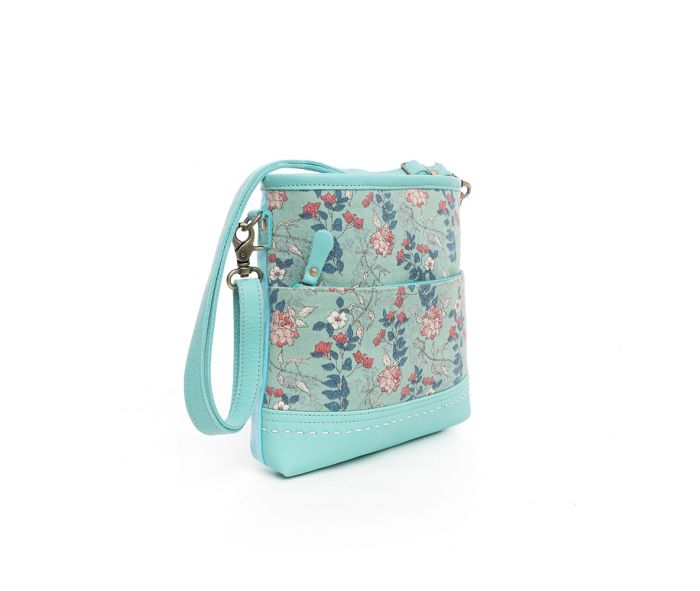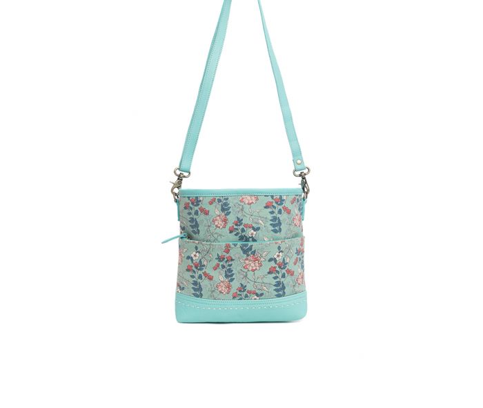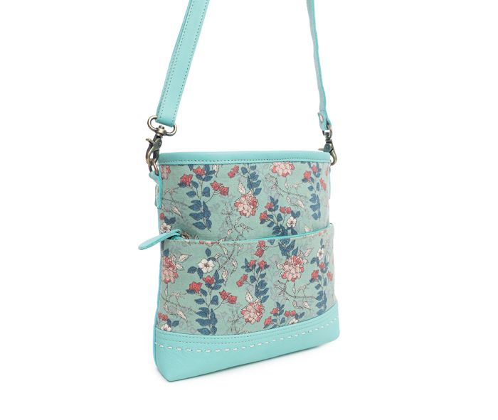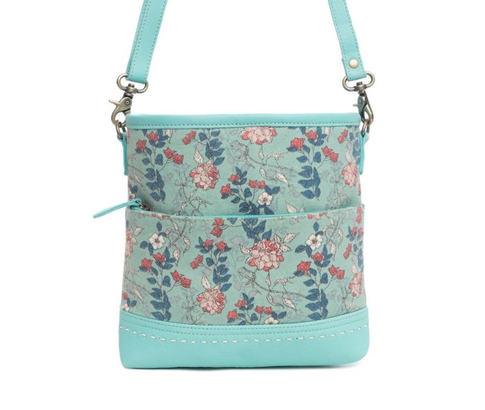 The Serafina Small Crossbody Bag is a charming accessory with delicate floral designs in soothing dusty hues. The bottom panel of bright turquoise leather and special stitch trim add a touch of vibrancy. The back features a woven canvas and a convenient zippered pocket. With a zipper-close top and detachable, adjustable shoulder strap, this bag is both stylish and practical.