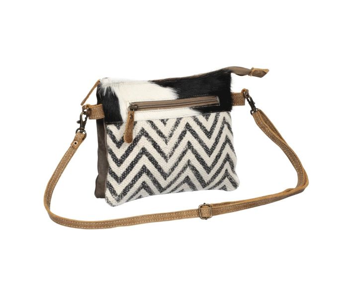 Make a statement with the Staggering Crossbody Bag. This stylish bag features a stunning black and white geometric pattern adorned with a matching suede finish - perfect for any occasion. It can be worn as a crossbody or a shoulder bag. It has a zippered top closure and a front pocket for easy access. Inside, you'll find two separate compartments and a zippered back pocket for extra storage.