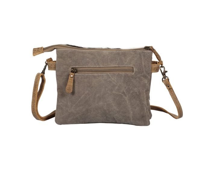 Material: Canvas, rug, and leather. Measures: 9.5" x 7.5" x 2.25. Shoulder: 23"