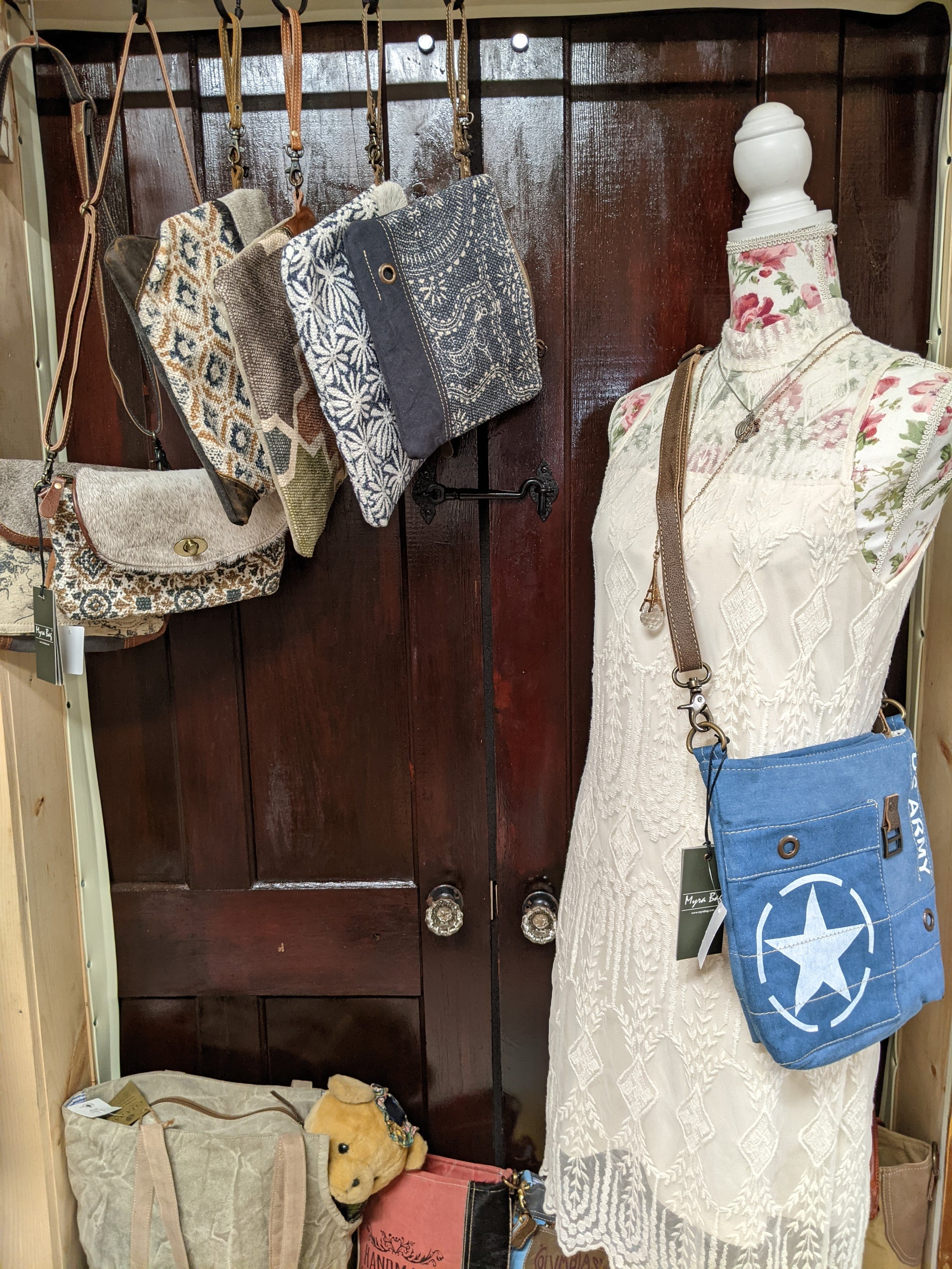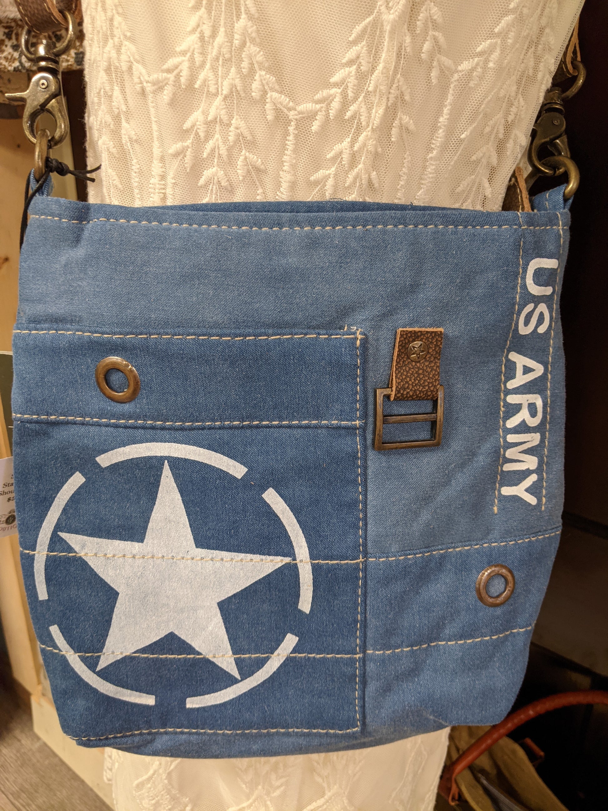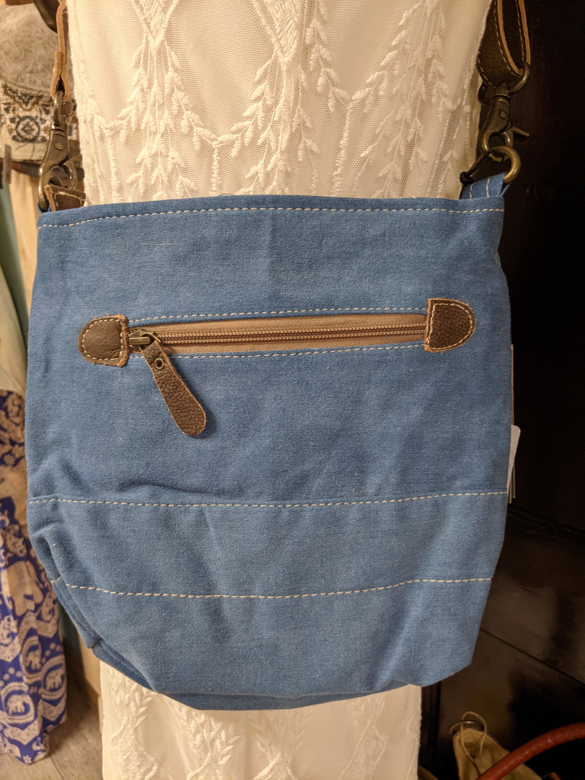 The perfectly sized bag for everyday use. Great denim that is super soft to the touch is paired with great graphics and leather accents. Zippered top closure, a zippered back pocket and three pockets on the inside will keep all of your belongings secure. Measures: 11" x 2.5"x 9.5". Material: Cotton and leather.