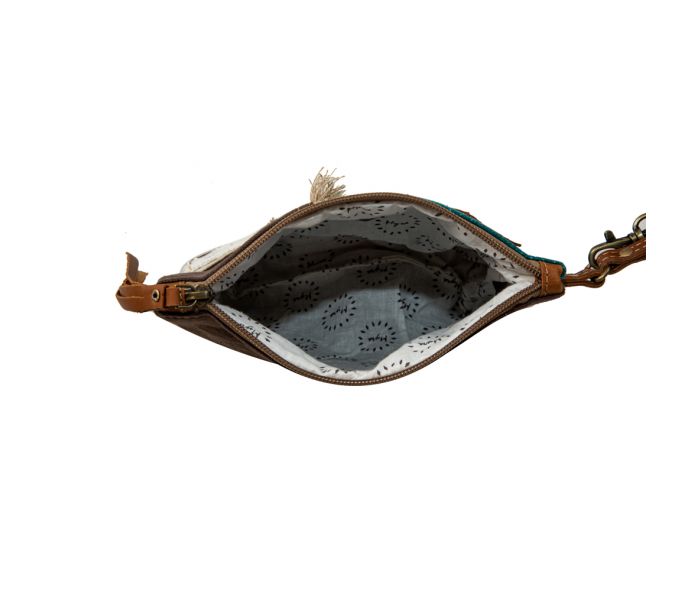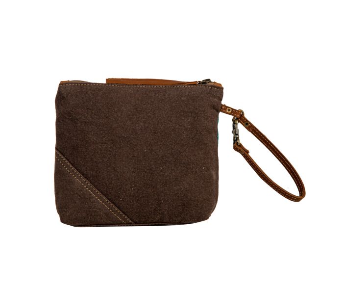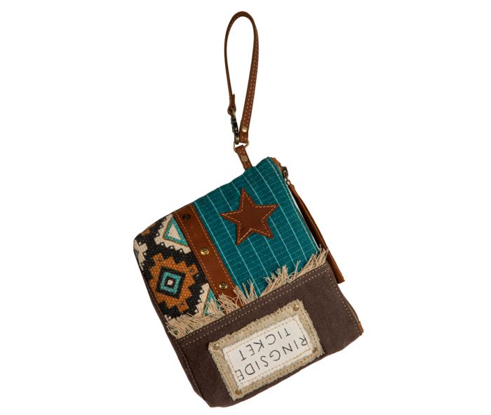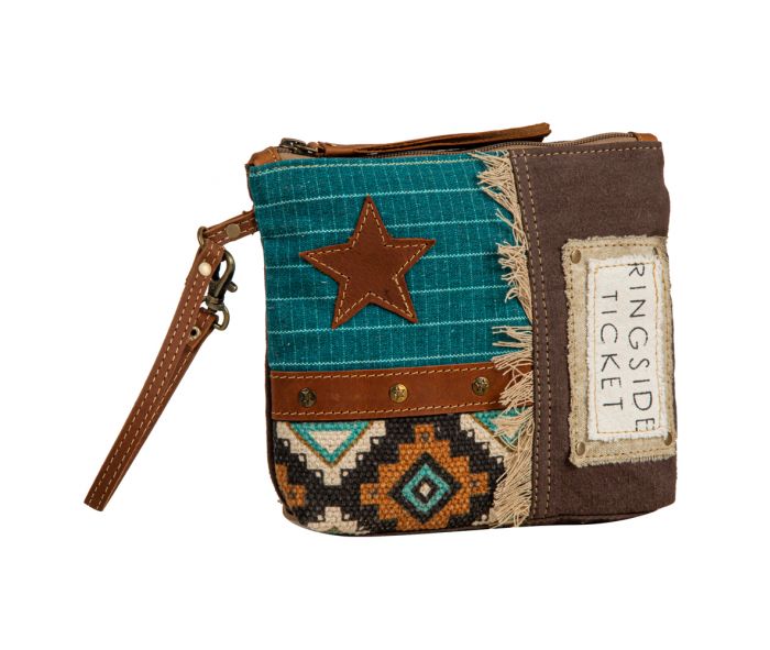 A style statement in and of itself, the Star Pacer Pouch is a meticulously crafted, designer accessory that is sure to be a conversation starter. This fashionable bag features an upcycled tribal rug, a hand-stitched woven patchwork canvas, a leather star, and a whimsical label for an eye-catching look. The pouch is finished with a zipper-close top, canvas back, and leather wristlet carrying strap, making it the perfect size for keeping your essentials close at hand.