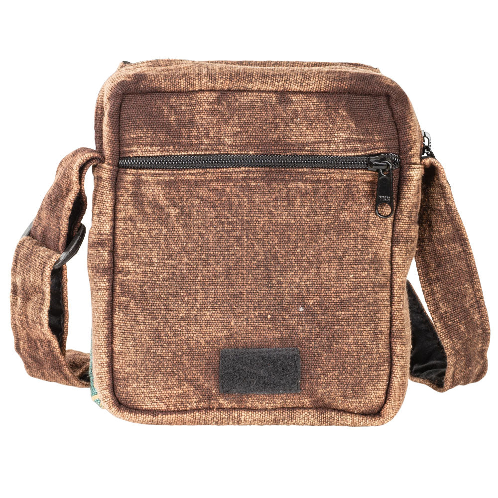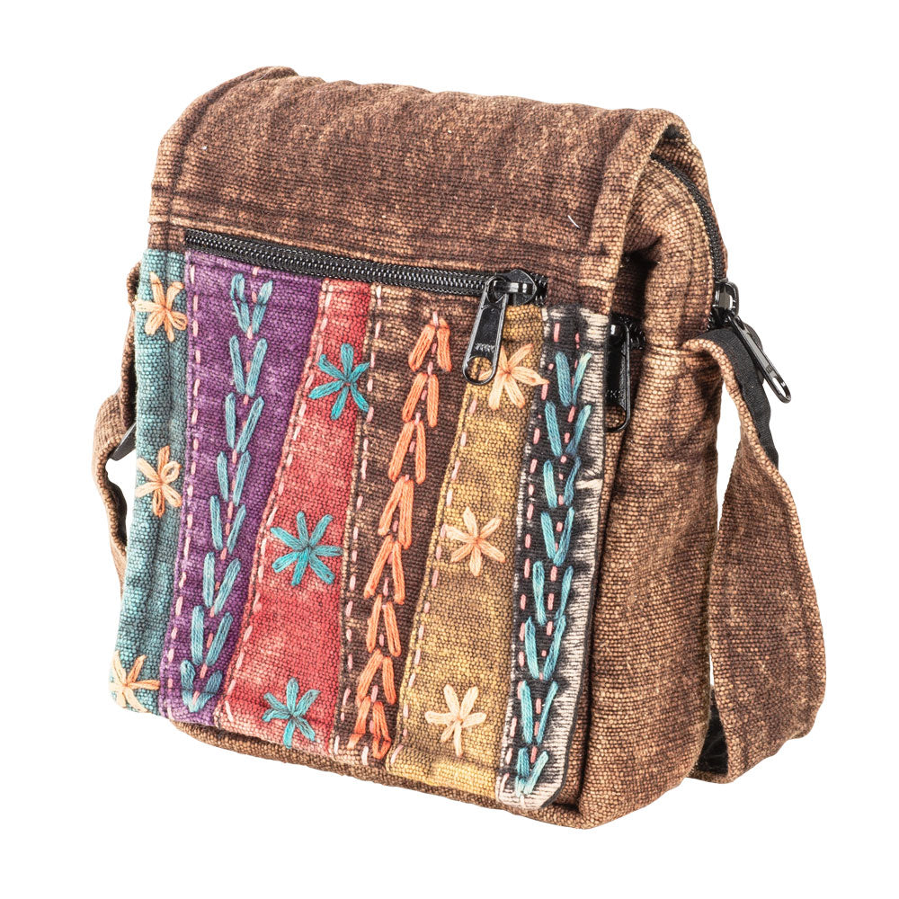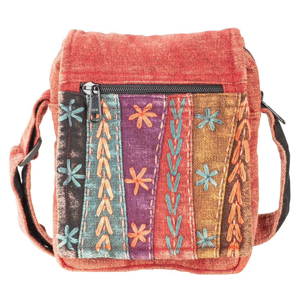 This backpack has everything going for it! It's colorful, adorned beautifully, and has plenty of space with a zippered outside pocket, zippered front pocket hidden by the front flap, and a generous opening for plenty of carrying capacity!
