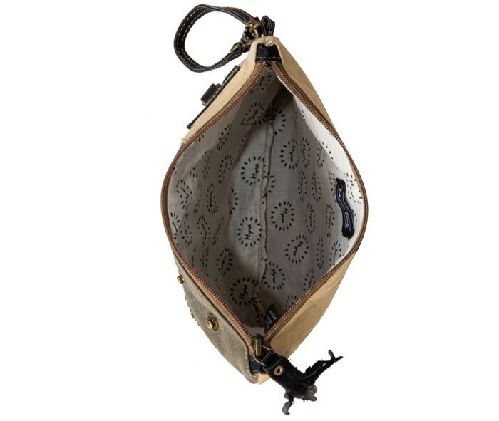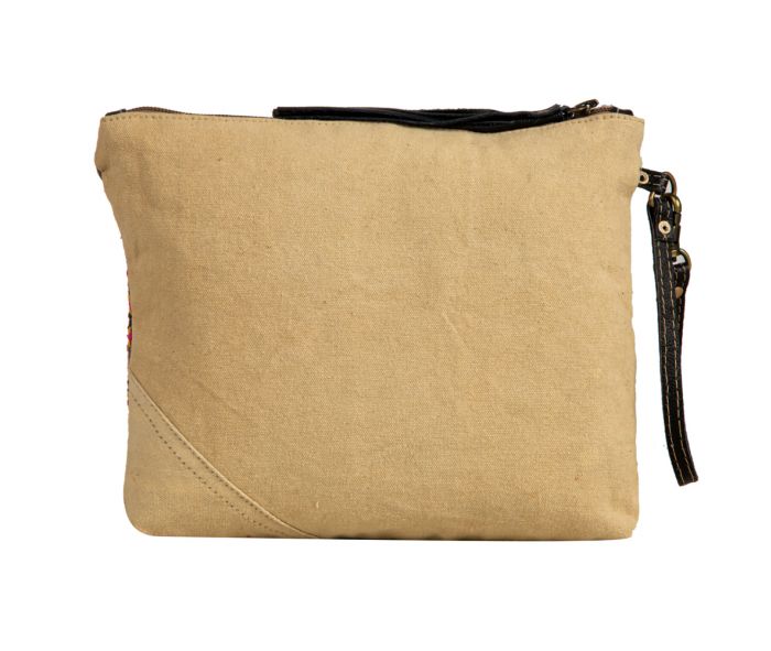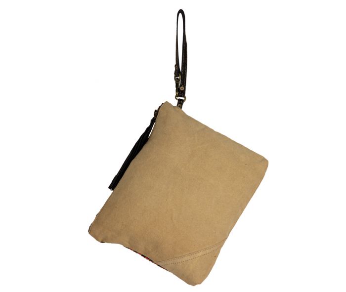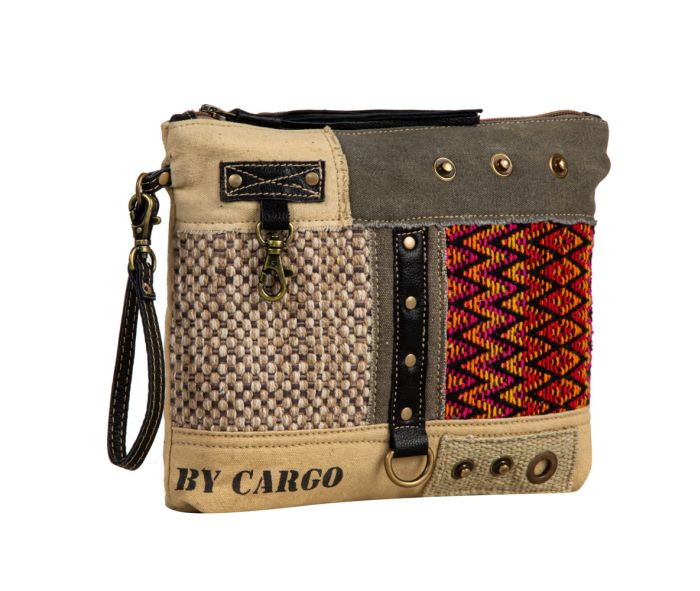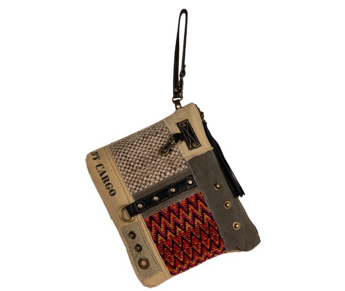Unlock your unique style with the Sundown River Vintage Pouch. Boasting a gorgeous patchwork of colorful upcycled rugs, leather, and intricate overprinting, this is an eye-catching wristlet sure to turn heads. Crafted with durable materials and a zipper-close top, it's reliable and stylish. The wristlet carrying strap in matching leather offers the ultimate convenience. Make a statement with this luxurious bag.