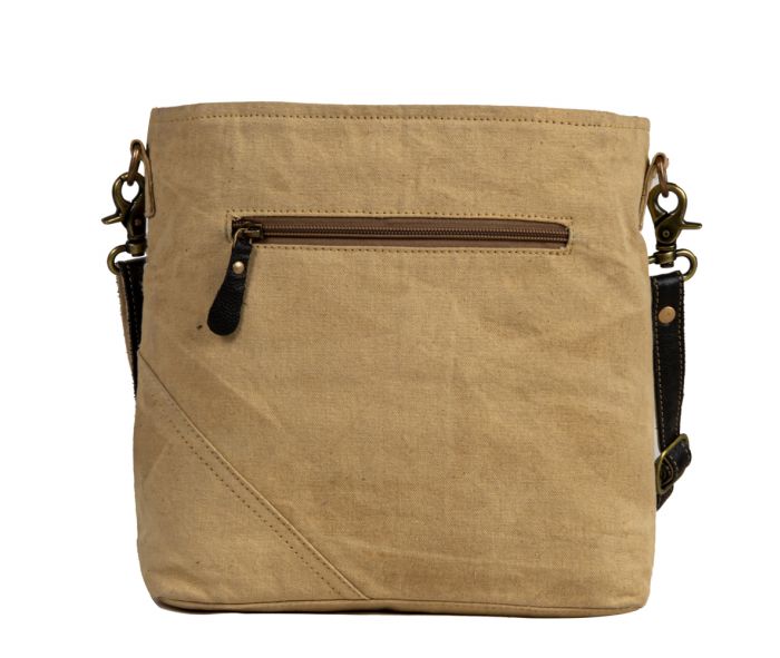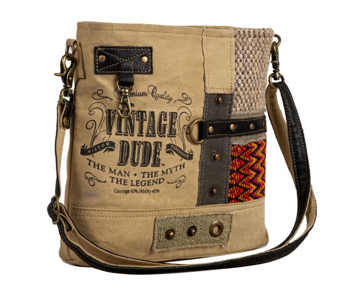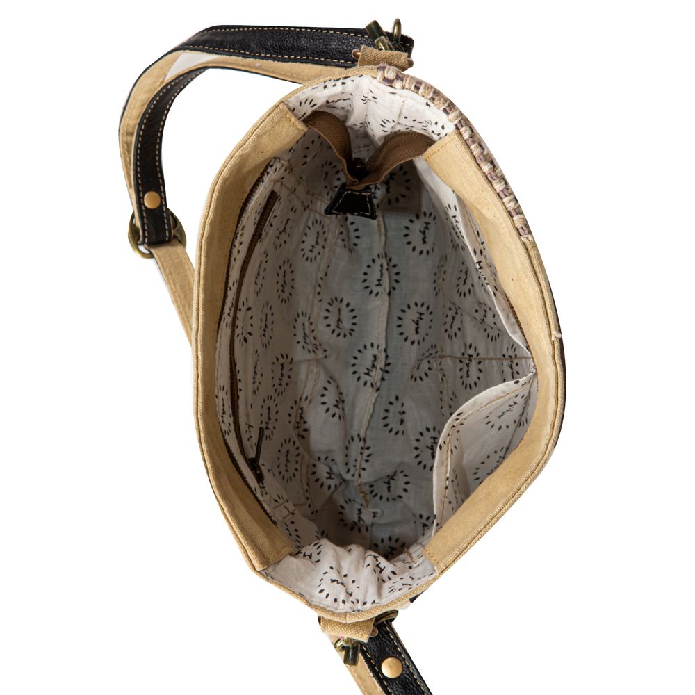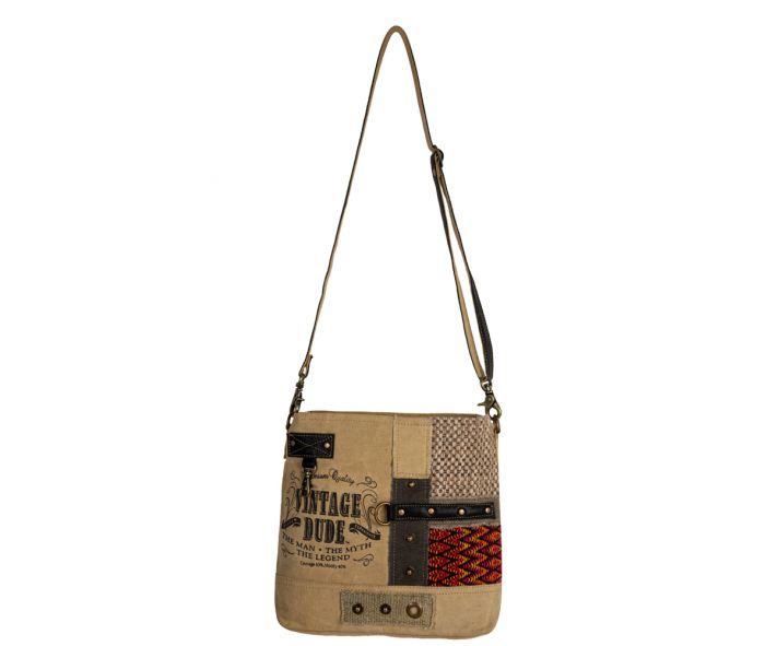 Be the envy of all with the Sundown River Vintage Shoulder Bag. Crafter with intricate woven patchwork canvas and tribal upcycled woven rugs in exquisite colors, this shoulder bag exudes elegance and luxury. Featuring a zipper-close top, canvas back with a zippered pocket, and adjustable, removable leather shoulder strap, this bag stands out with its evocative detail and tasteful overprinting. It's a standout piece for any ensemble.