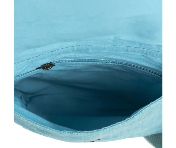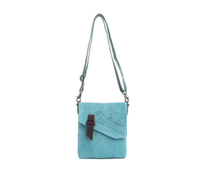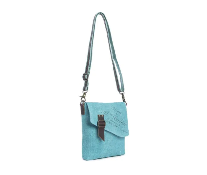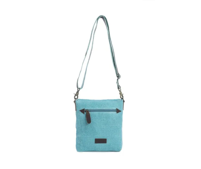 The Tanglewood Shoulder Bag is both stylish and sustainable, made from upcycled sky turquoise woven canvas. It features a leather strap and buckle on the front flap, while the back offers an additional zippered pocket. With a removable and adjustable shoulder strap, this bag is both versatile and stunning.