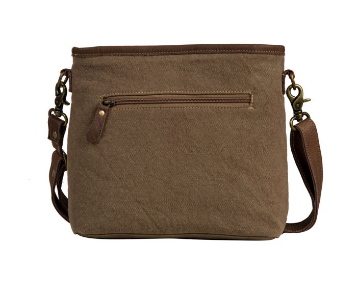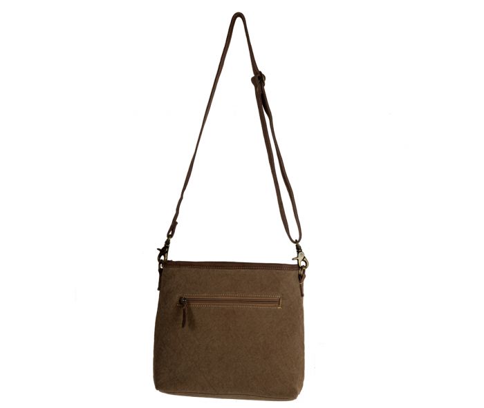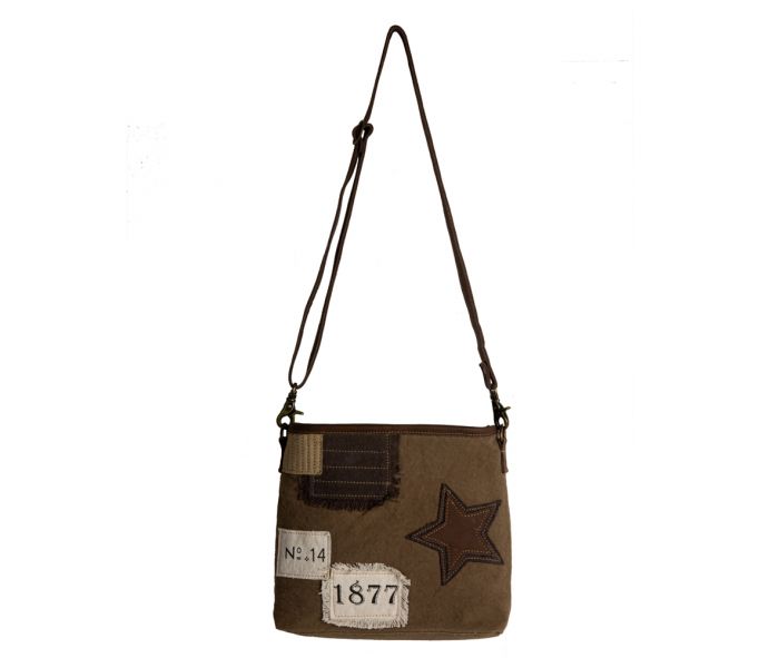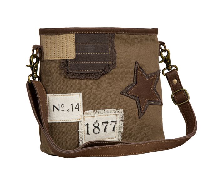 This unique vintage-style shoulder bag is stylish and functional. With a patchwork canvas design featuring frayed-edge treatments, a decorative leather accent star, and fanciful labels, it will surely add charm to any outfit. It features a zipper-close top, two inside drop pockets, and a zippered back pocket for extra security. Its adjustable and removable shoulder strap in matching leather makes it durable and comfortable to carry.