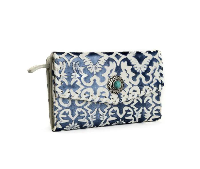 Expertly crafted with embossed leather and a stylish metal concho, the Wapanuka Wallet is a must-have accessory for any occasion. With multiple sections for organizing and securing cards, IDs, and other essentials, this wallet combines functionality and elegance. Snaps closed for added convenience. Upgrade your style game with the Wapanuka Wallet.