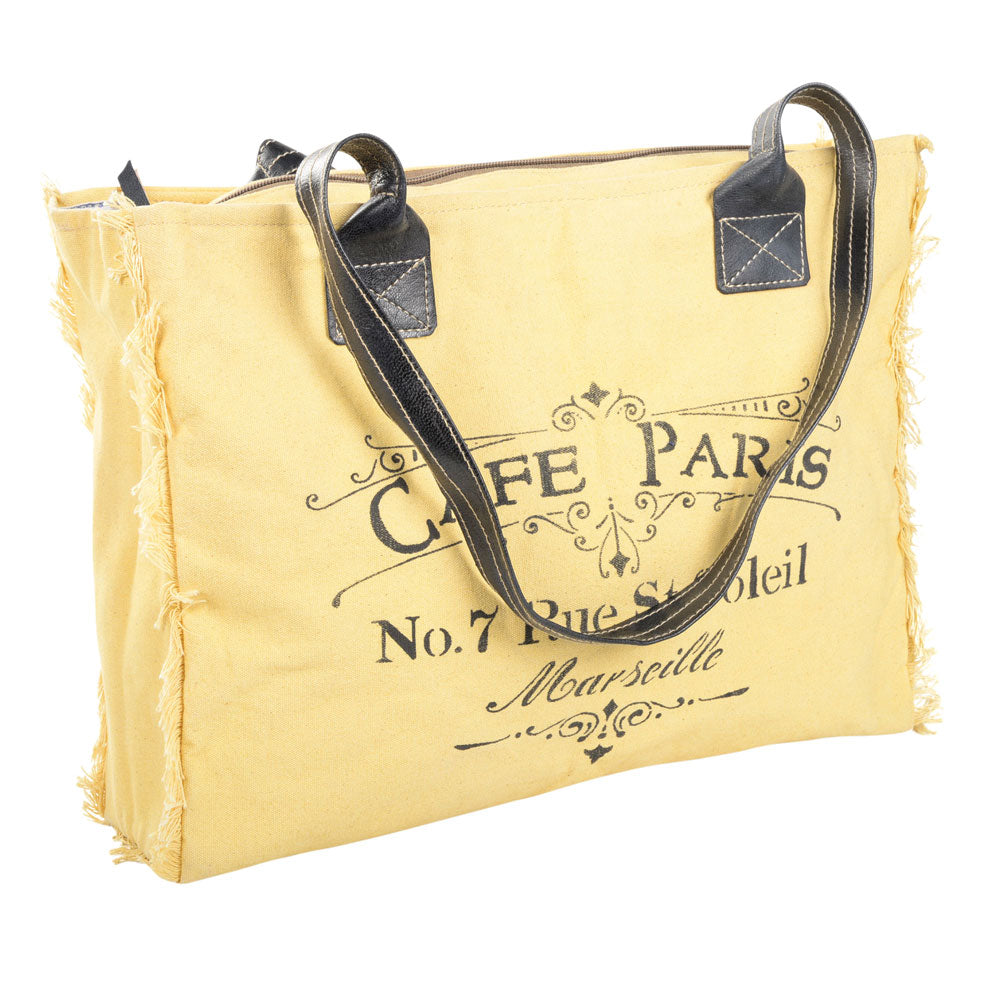 Introducing the Cafe Paris Tote, crafted from luxurious yellow canvas and accented with sleek leather handles, this stylish tote pays homage to the City of Light. With a zippered back pocket to store small items, a zippered top closure to secure your belongings, two inside drop pockets, and a zippered inside pocket, this elegant and practical piece will become your go-to companion.