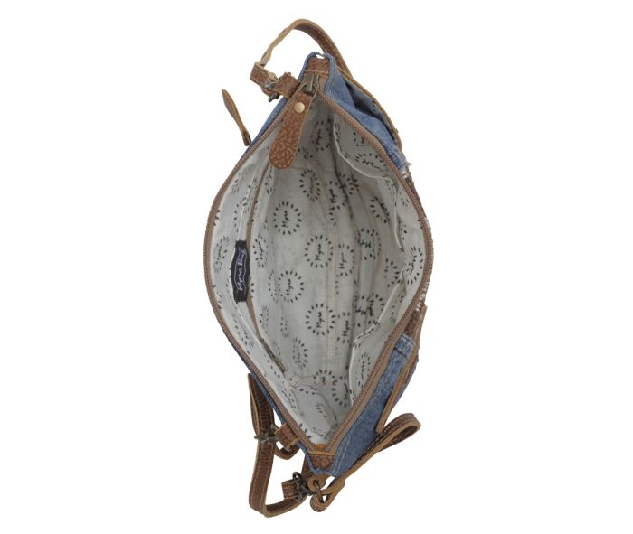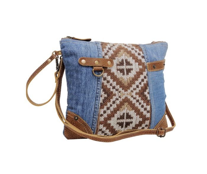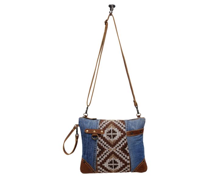 This versatile pouch is made from upcycled denim and rug, accented with leather and metal details. The soft, buttery denim material feels luxurious, while the top zipper closure, back zippered pocket, inside zipper pocket, and two drop pockets provide practicality. Wear it as a stylish crossbody or a chic pouch.