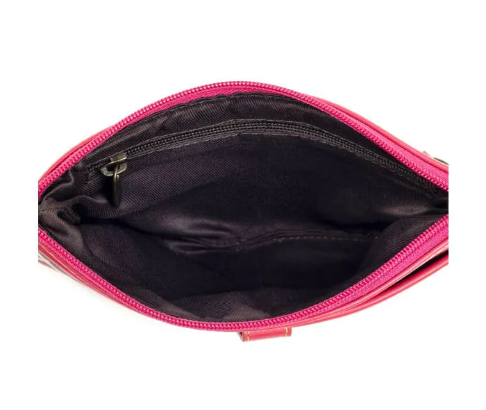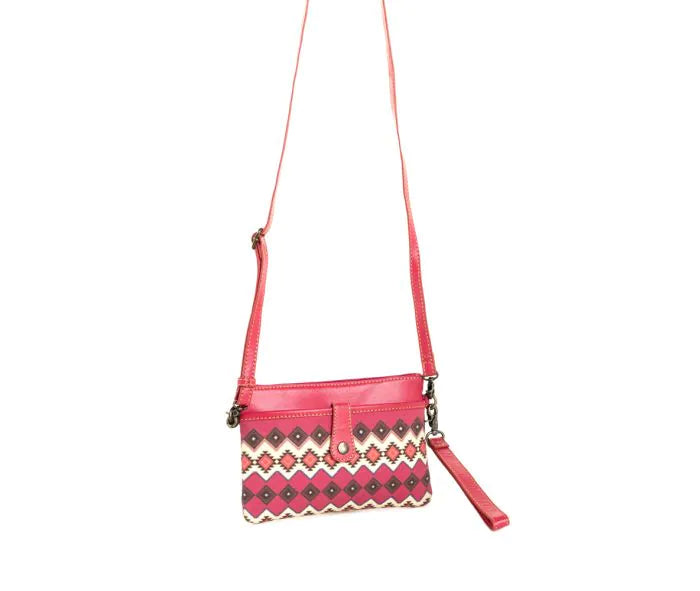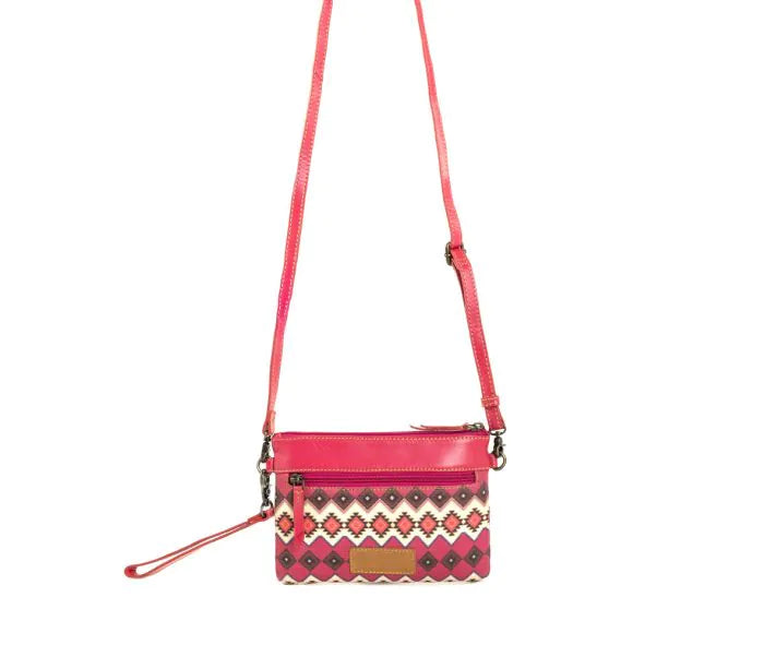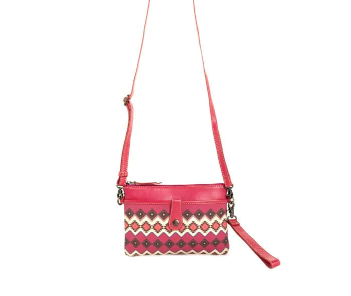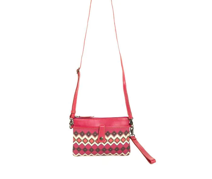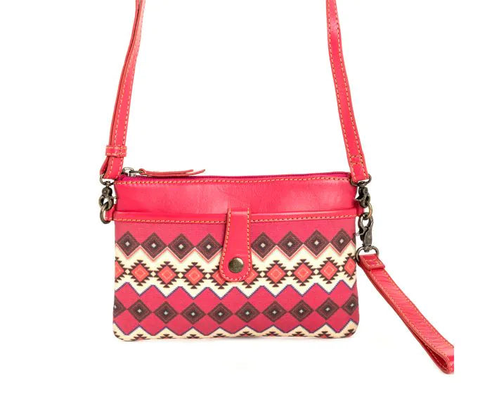 Expertly crafted with upcycled woven canvas in a stunning tribal pattern, the Empress Pointe Crossbody exudes dynamic elegance. The front slip pocket with snap closure and zipper close top provide convenient access, while the zippered back and inside pockets offer secure storage. Includes wristlet and adjustable shoulder strap in matching leather.