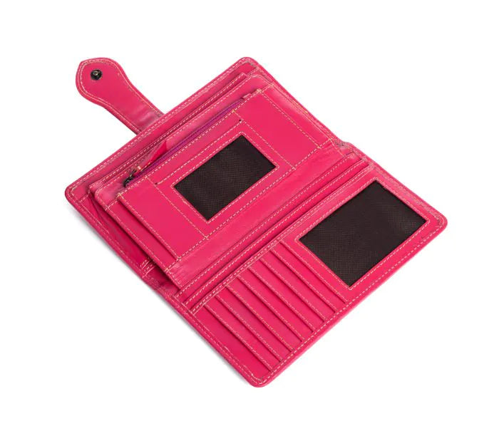 The Empress Pointe Deluxe Wallet features a soft woven canvas exterior adorned with buttery soft pink leather, making it both stylish and durable. With a snap front closure, multiple credit card slots, a zippered change pocket, and a billfold, this wallet offers both convenience and organization.