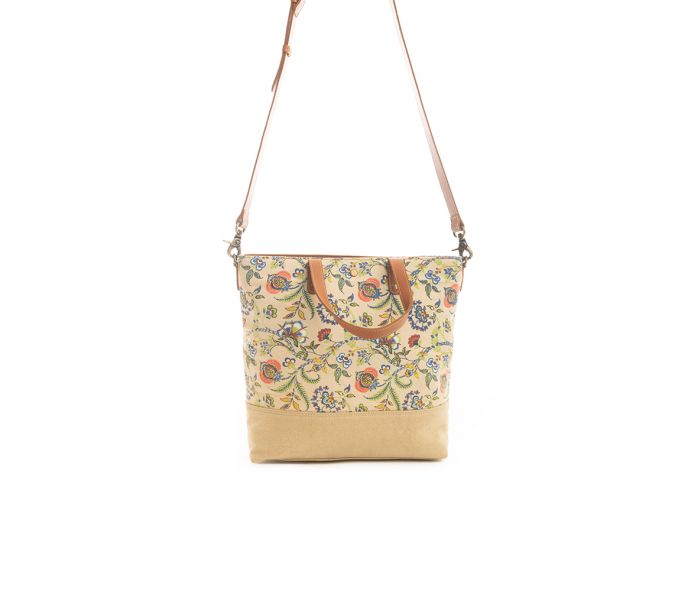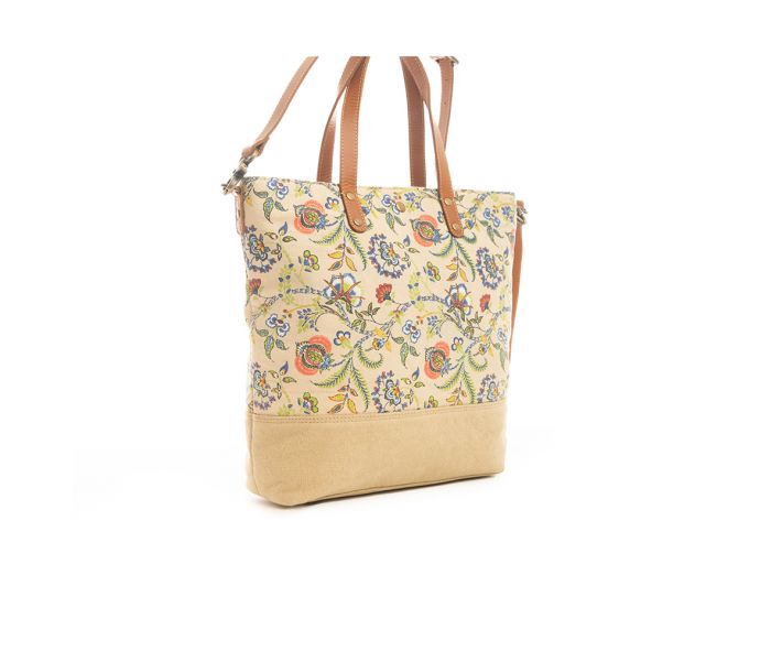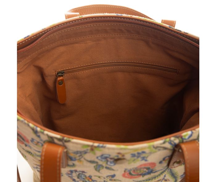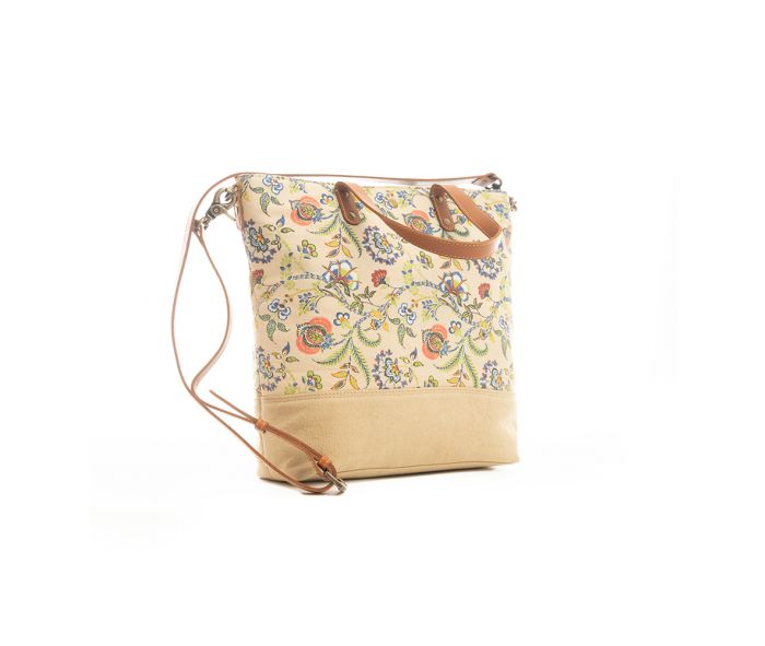 This elegant Tallie Jo Floral Tote Bag combines a delightful floral pattern with sunrise ecru woven canvas, accented by hues of salmon, blue, green, and wheat gold. The spacious interior, zipper close top, and handy back zippered pocket make it stylish and functional. Complete with caramel leather handles and a detachable shoulder strap, this tote is perfect for any occasion.