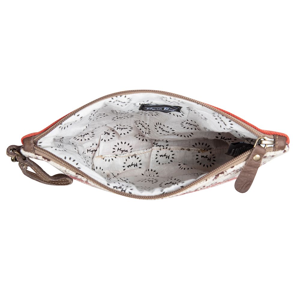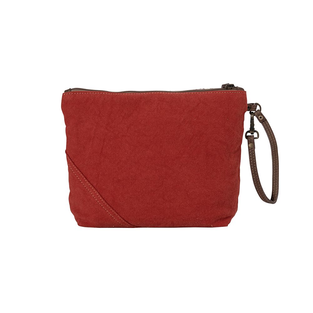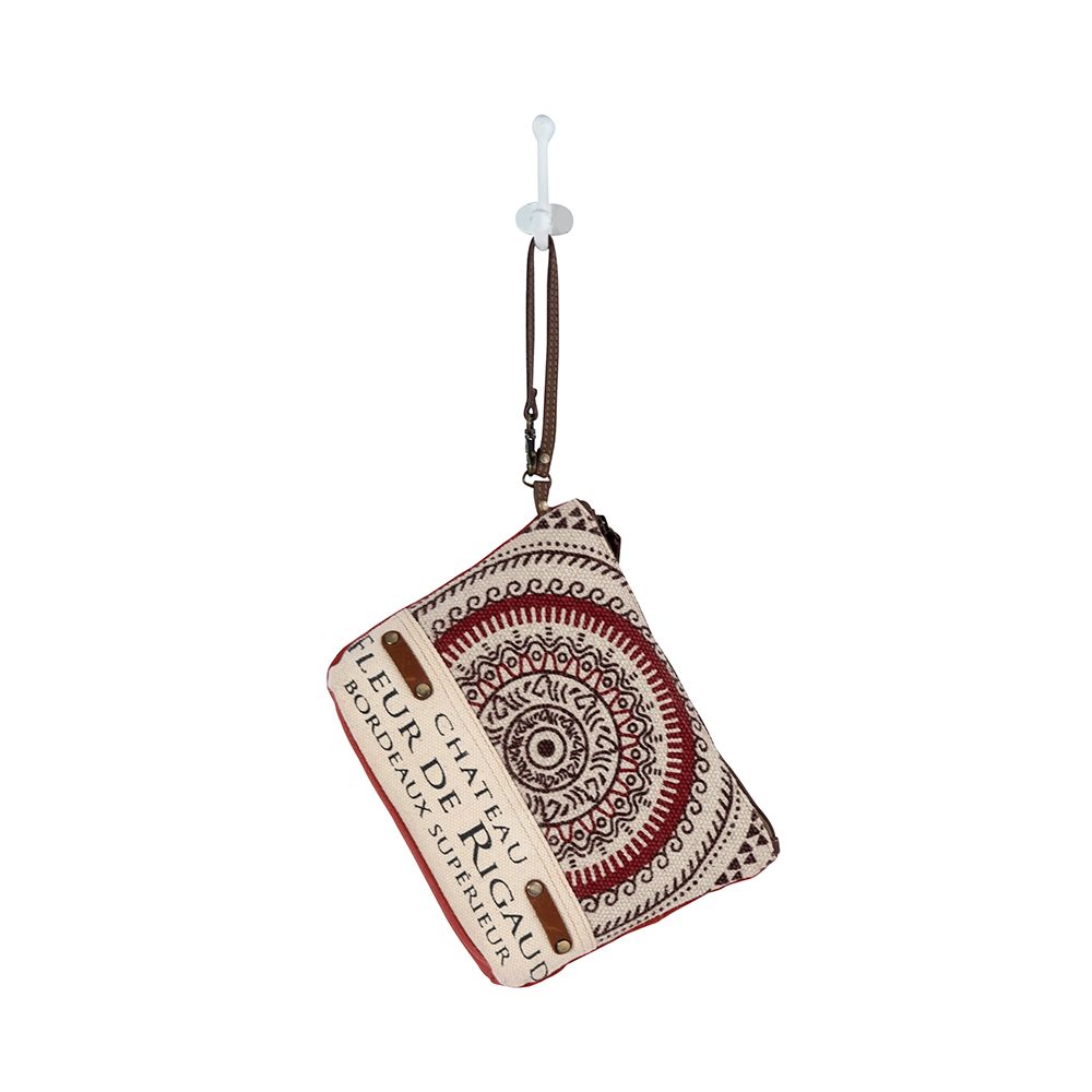 Indulge in the world traveler charm of the Fleur de Rigaud Pouch. The delightful pattern and French wording overprint add a touch of elegance. The zipper top closure and chocolate brown leather wristlet make it perfect for carrying your essentials.