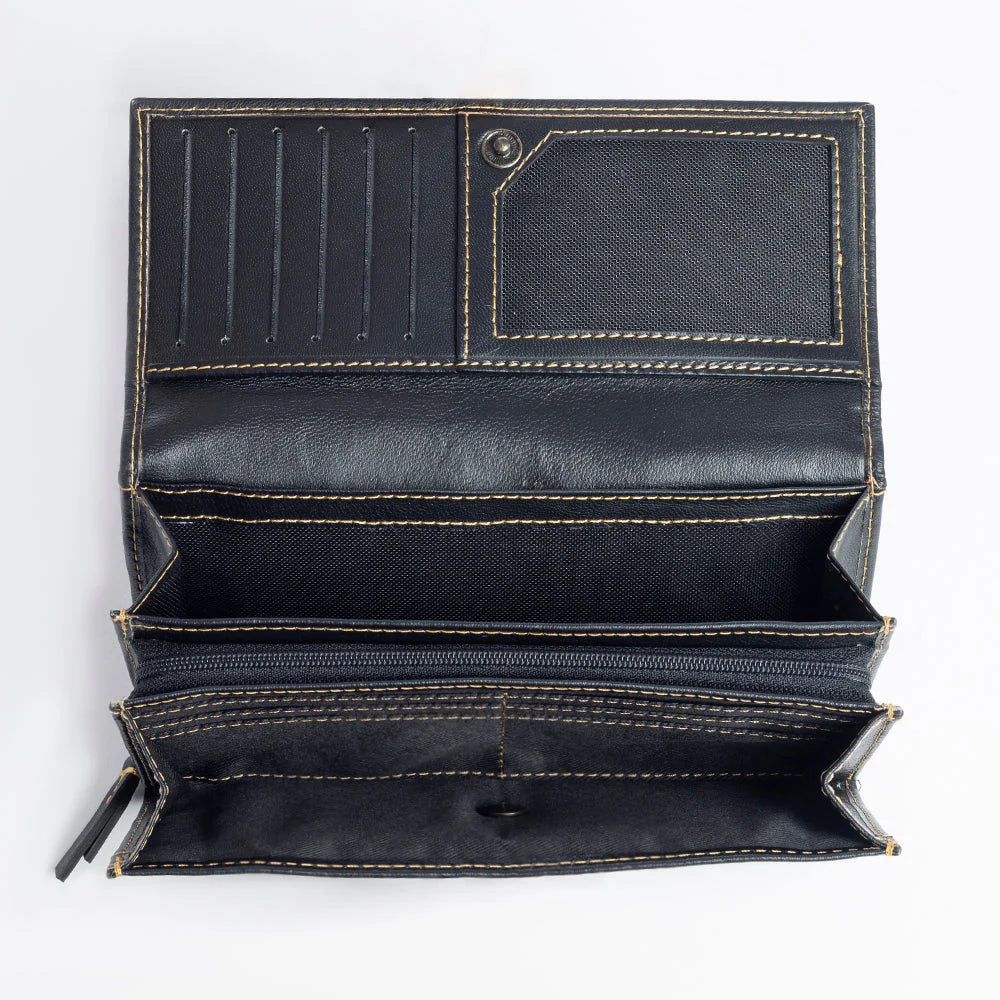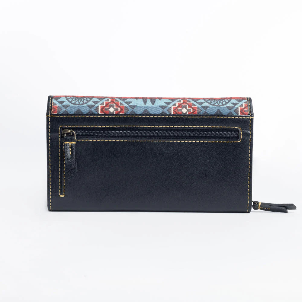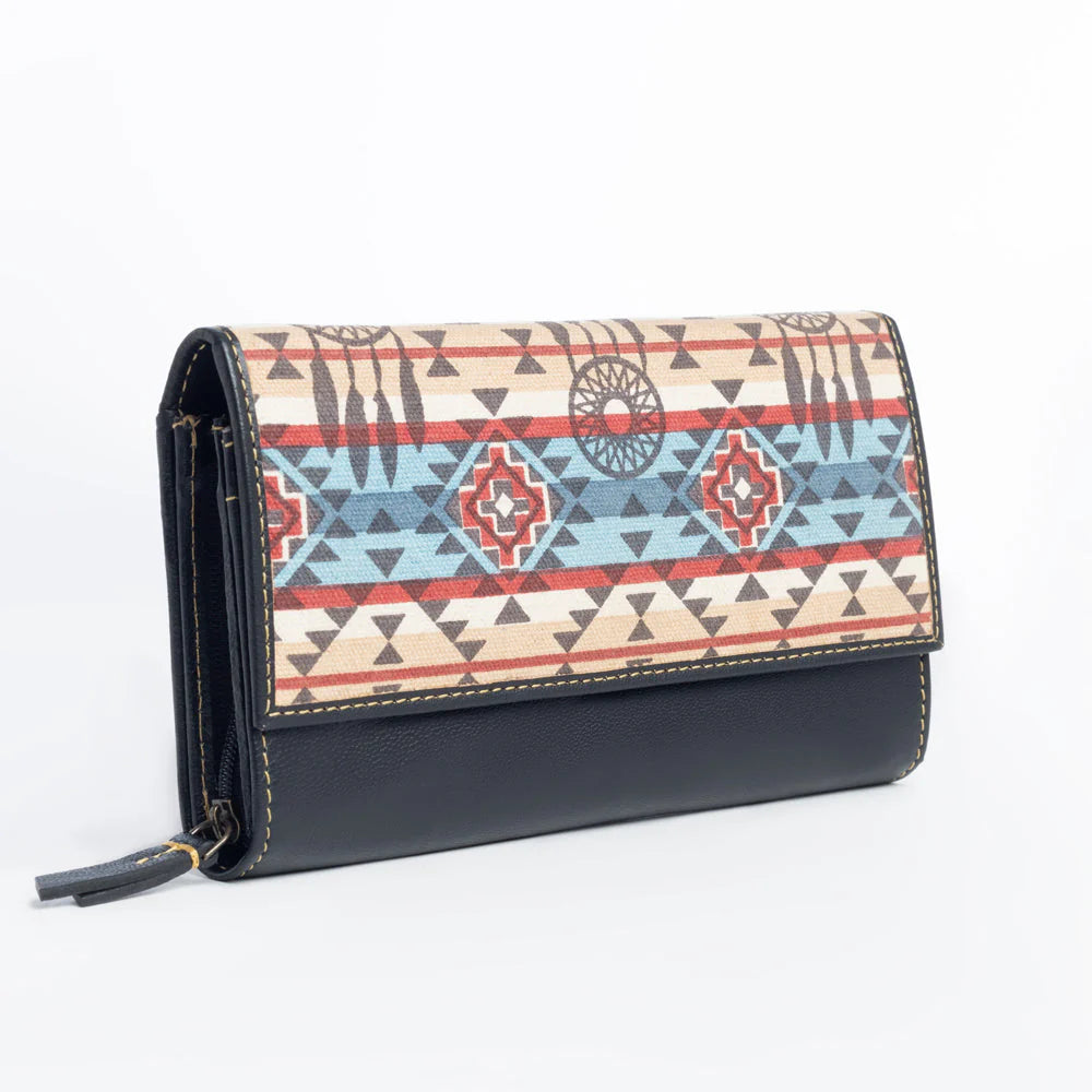 The Fountain Trail Deluxe Wallet showcases authentic Southwest patterns and rich hues, expertly set in luxurious ebony leather. Designed with practicality in mind, it offers organized spaces for cards and cash alongside a secure zippered pocket. This wallet strikes a balance between refined craftsmanship and functional design, making it an ideal accessory to express your personal style with confidence.