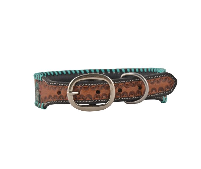 Introducing the Full Bloom Hand-Tooled Leather Dog Collar, a luxurious accessory for your beloved companion. This collar is a work of art, crafted with ebony and brown leather and adorned with a teal ribbon. The eye-catching red and teal embossed accents are complemented by metal details, ensuring both style and durability.