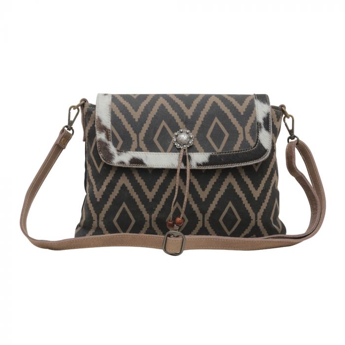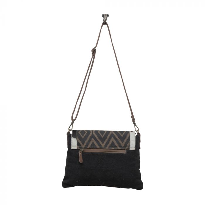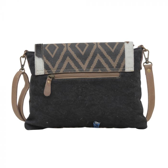 Perfectly paired suede with a stunning geometric pattern in a gorgeous color is so eye-catching! A magnetic clasp closes the outside flap. When opened, it reveals a top zippered closure with two drop pockets inside and a zippered pocket. An extra zippered pocket on the back keeps your most used items secure.