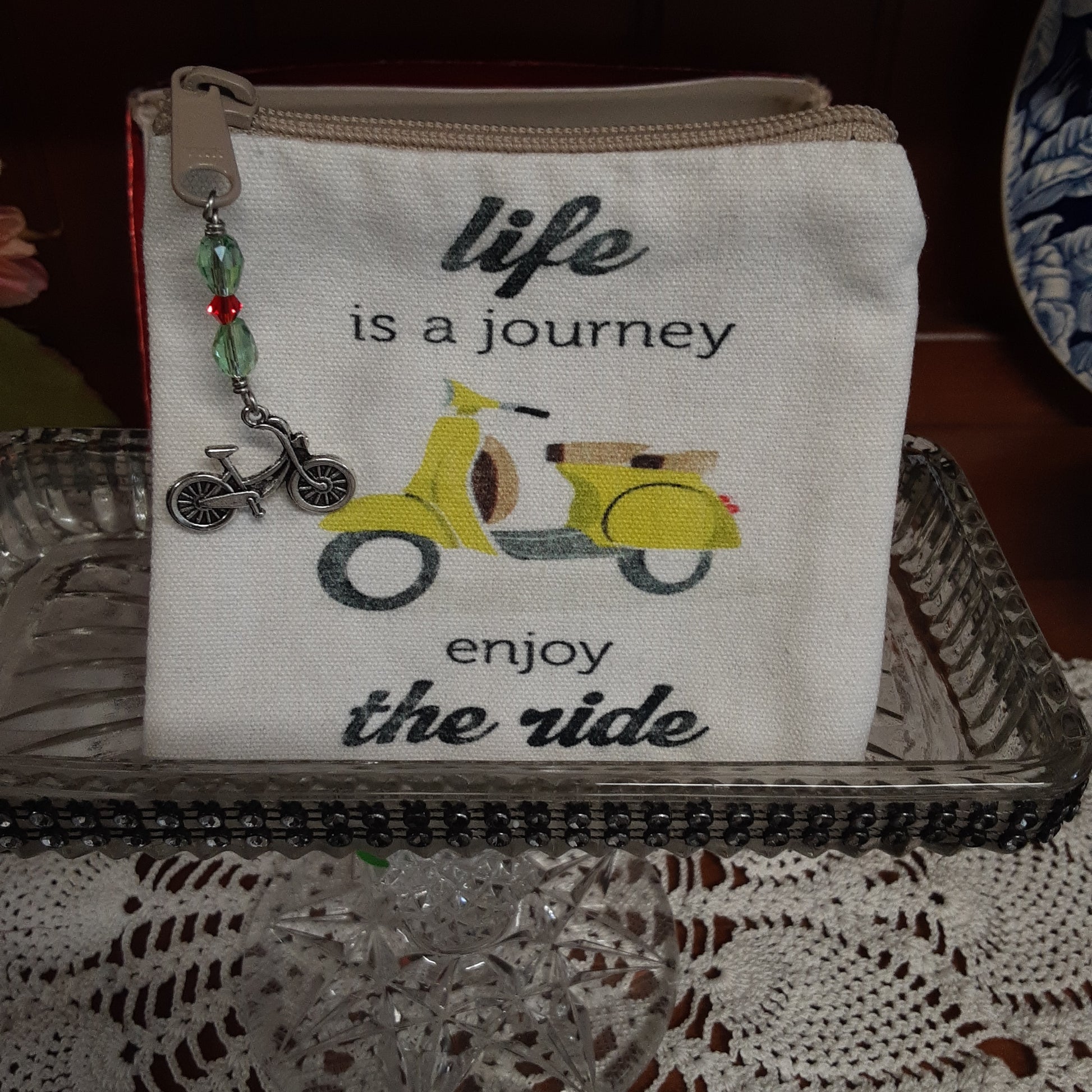 A handy coin purse with color and style. Adorned with a handmade zipper pull. Measures 3 1/2" x 4".