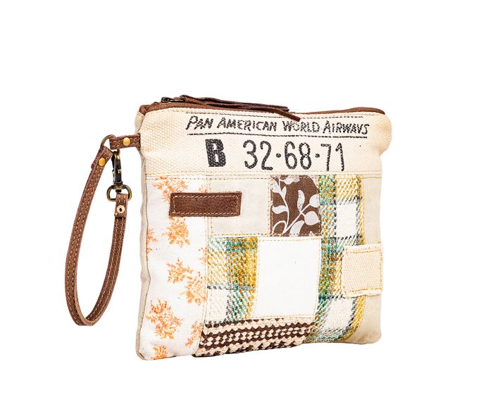Travel in style with the Pan American World Airways Pouch. Its charming design, made from woven canvas and upcycled rug, captures the allure of travel from years past. The leather tassel and stitching details add a touch of elegance. With a zipper-close top and a convenient wristlet strap, it's the perfect accessory for storing your essentials.