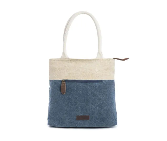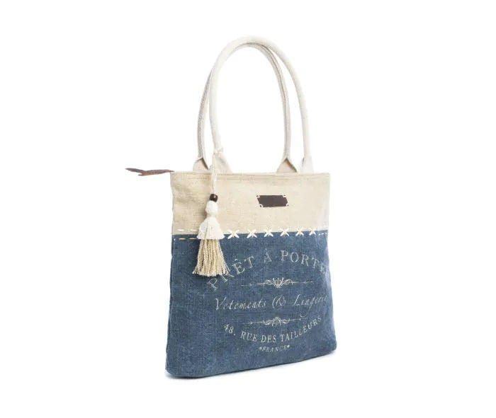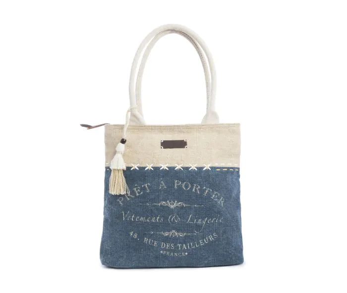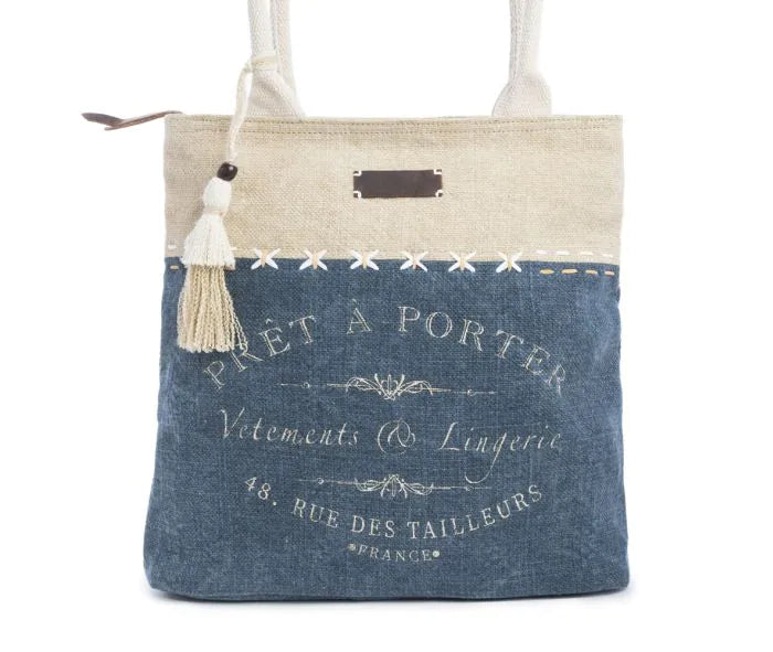 Transport yourself to faraway lands with the Ports of Call Tote. Made from upcycled canvas, the duo-tone denim blue and wheat colors add charm while the tassel adds elegance. With a spacious interior and secure zipper closure, this bag is perfect for your travels. Expertly crafted with matching woven canvas handles, it's a unique and must-have accessory.