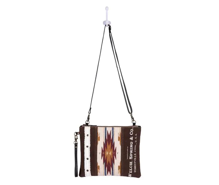 Introducing the Welch Spring Crossbody Bag - a stunning blend of tribal and vintage flair. The upcycled woven rug serves as the centerpiece, surrounded by patchwork canvas, leather, and intricate brad accents. This bag exudes exclusivity and charm with a removable shoulder strap and matching woven canvas back. Elevate your style with this beautiful bag.