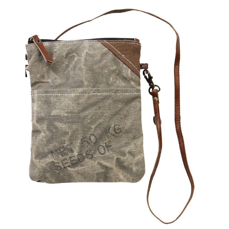Material: Recycled military tent and canvas with leather accents. Measures: 6" x 8" Adjustable strap.
