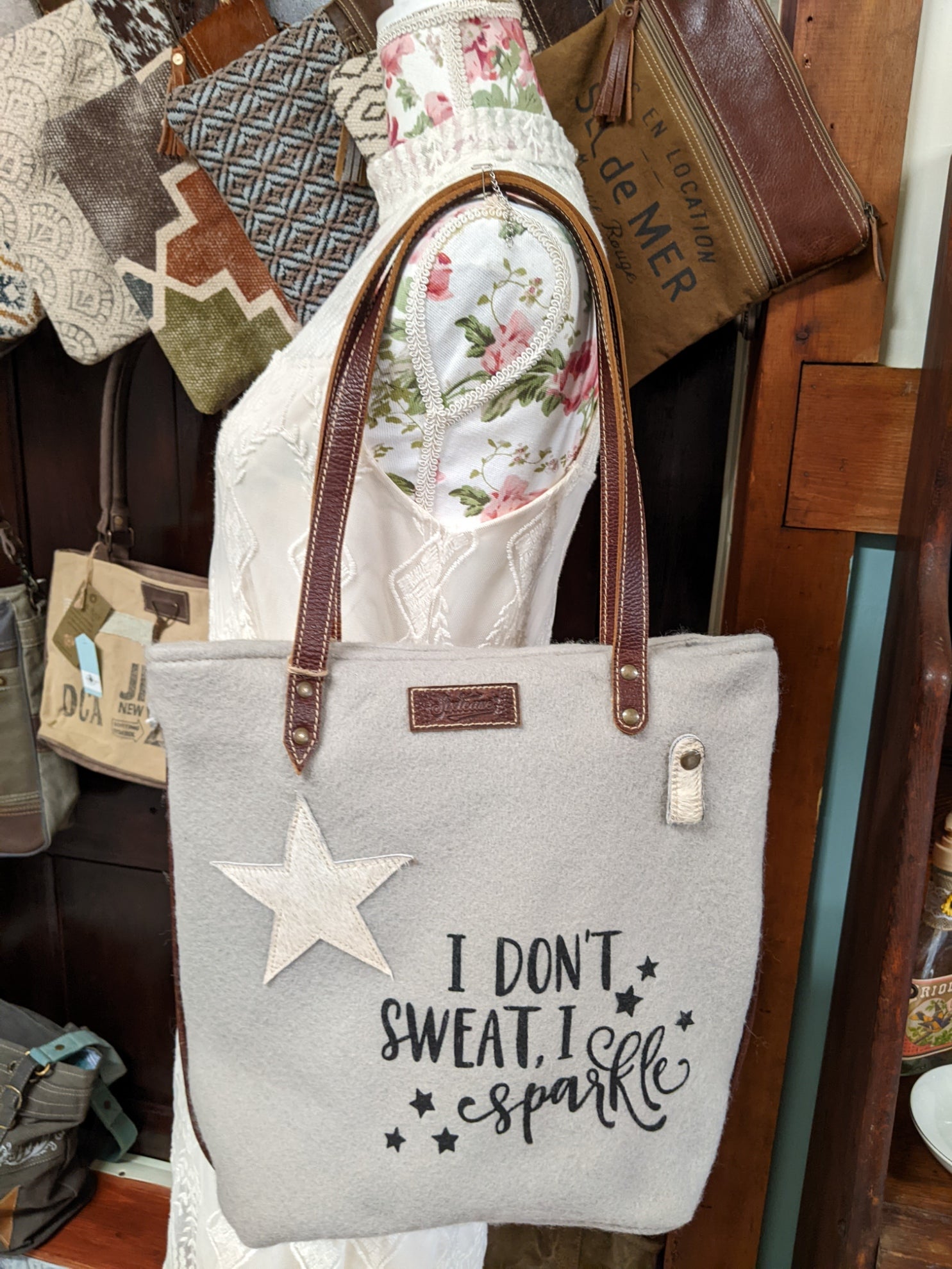 Show off your sense of humor with this amazing recycled fabric shoulder bag! Front snap for keys, water bottle, or anything that you can snap close. Fully lined, with one inside zippered pocket and two open pockets. Zippered top closure with a back zippered pocket. Stitched to perfection with a debossed Sixtease leather logo.