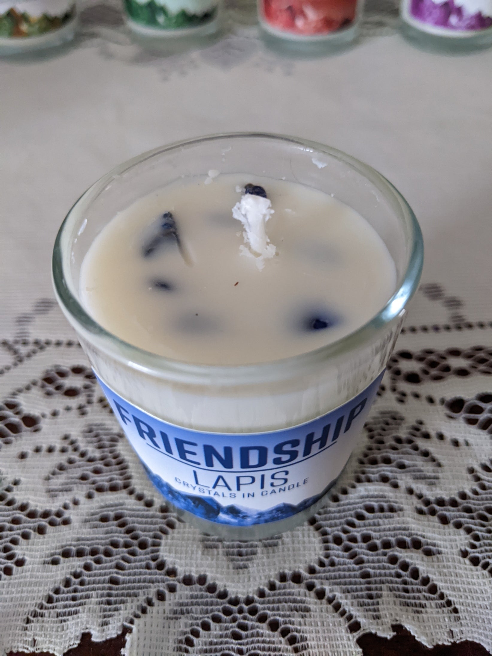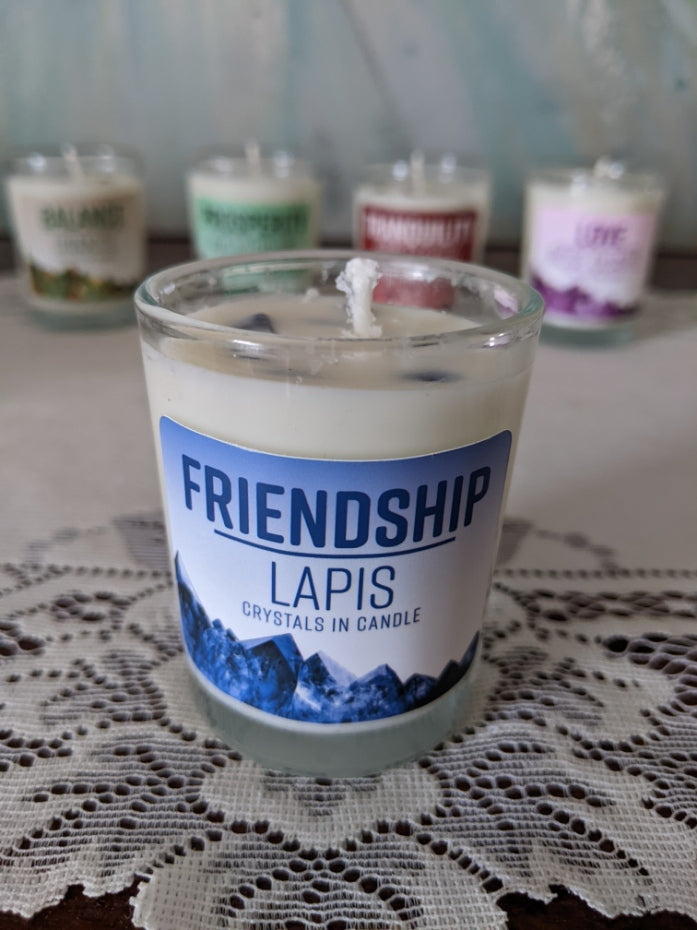 Beautifully crafted soy candle that is infused with energy from crystals and stones. Bring the properties of friendship with this Lapis-infused candle.