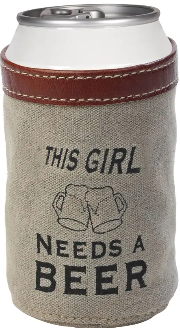 This beer-insulated cover is made of canvas, and leather on top gives it a rich look. It has a quote that says, "This girl needs a beer."