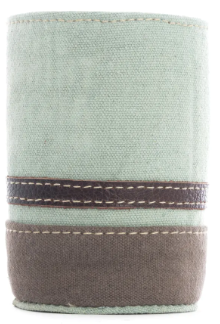 This insulated beer cover is made of two-tone canvas, giving it a sophisticated appearance. It features the quote, "I wonder if beer thinks about me too."