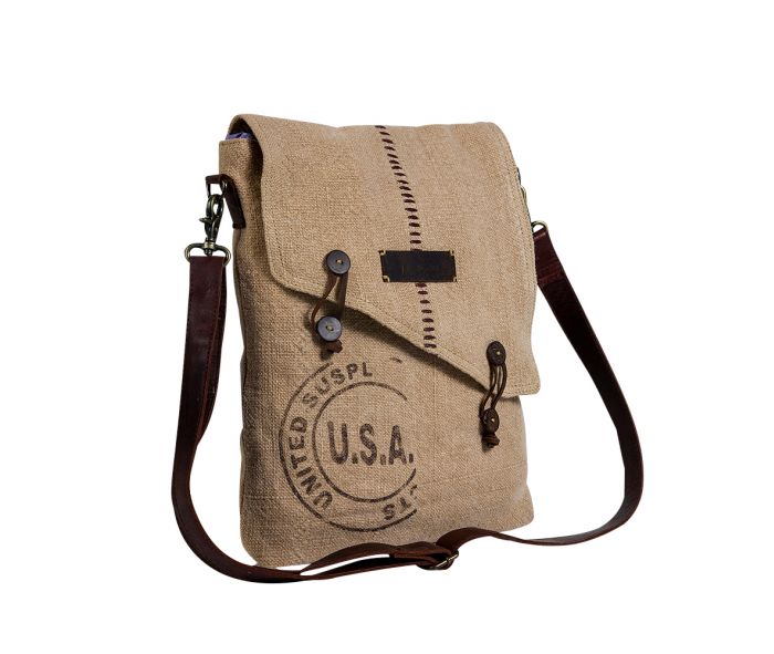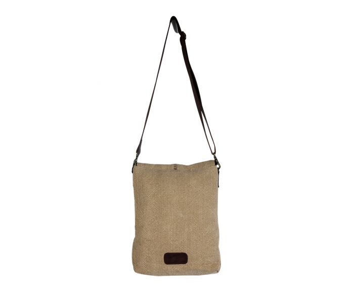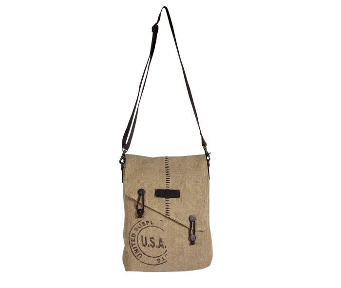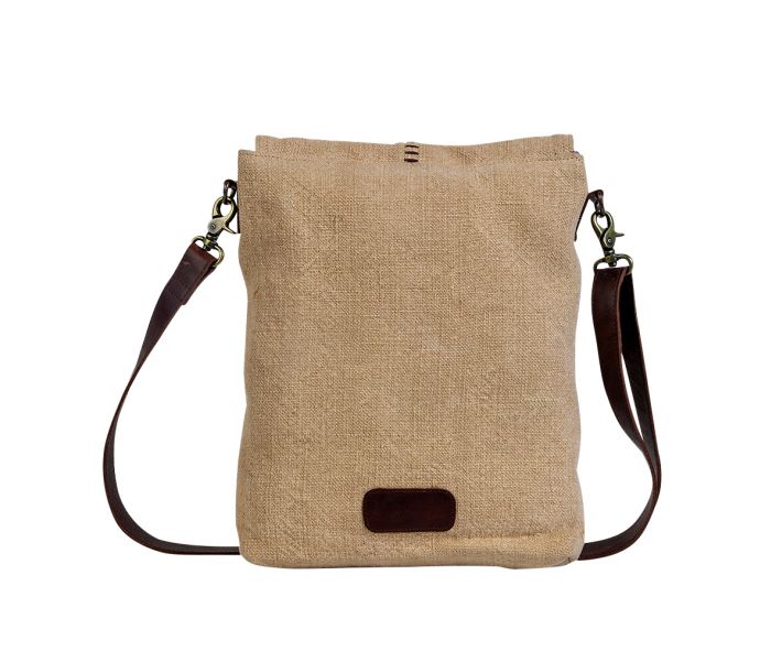 This alluring bag of woven canvas with a burlap look features a great asymmetrical front flap, unique stitching, and button and string closures. A partial stamp adorns the lower corner. Two slip pockets and one zippered pocket on the inside. The matching leather adjustable shoulder strap is fully detachable. A delightful bag with a distinct vibe!